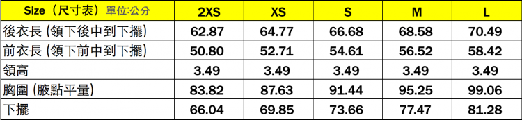 附註:車衣尺寸表,若您的回饋品中有車衣的項目,請記得留言給我們您需要的尺寸。