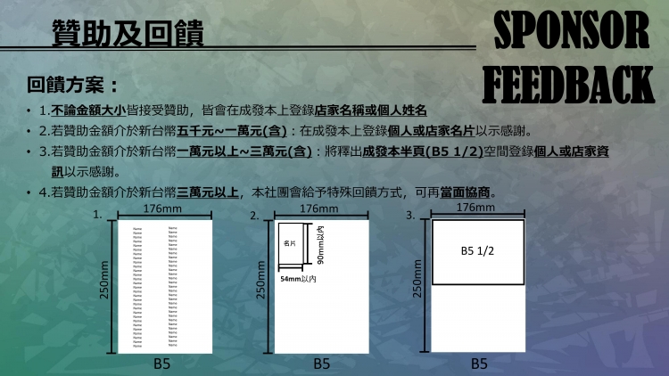 若贊助金額介於新台幣一萬元以上~三萬元(含):將釋出成發本半頁(B5 1/2)空間登錄個人或店家資訊以示感謝