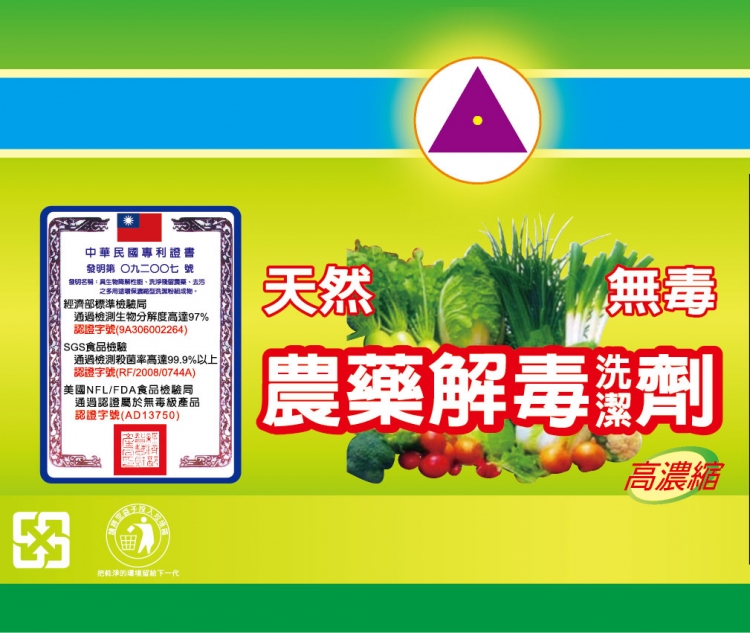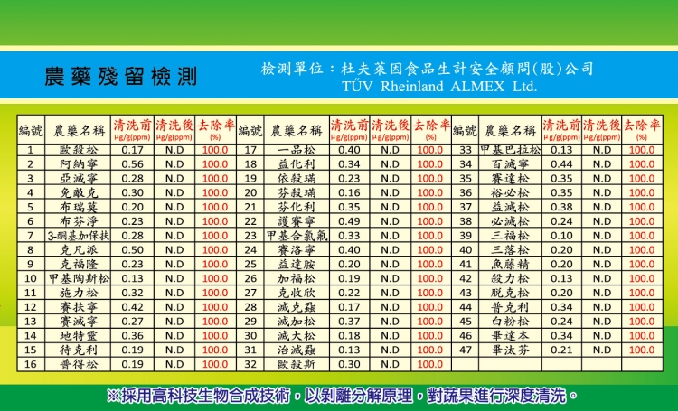 所用原料及步驟對大部分農藥及生菌處理效果卓著達98%,皆無毒可食用,不殘留