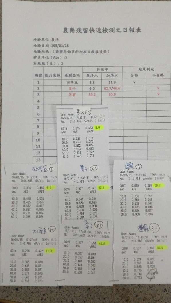 檢驗儀器採用農委會農試所研發的農藥快篩儀器及蒼蠅酵素檢測劑檢測