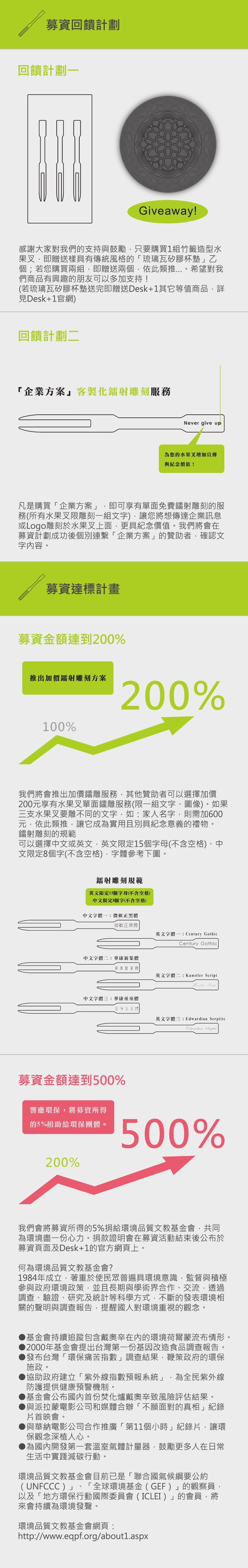• Q&A: 1.產品何時可以收到? 我們將在專案結束後,立即開始生產,預計1個月內完成,並寄給參與募資的朋友們。 2.退換貨處理? 如果消費者不滿意,麻煩將產品掛號寄回,我們收到貨品確認無誤,會將貨款匯給您。 3.如果有其他問題,如何聯繫? 歡迎您以mail提供建議或疑問,我們會一一回覆。或者也可以上我們網站留言:www.deskplus1.com