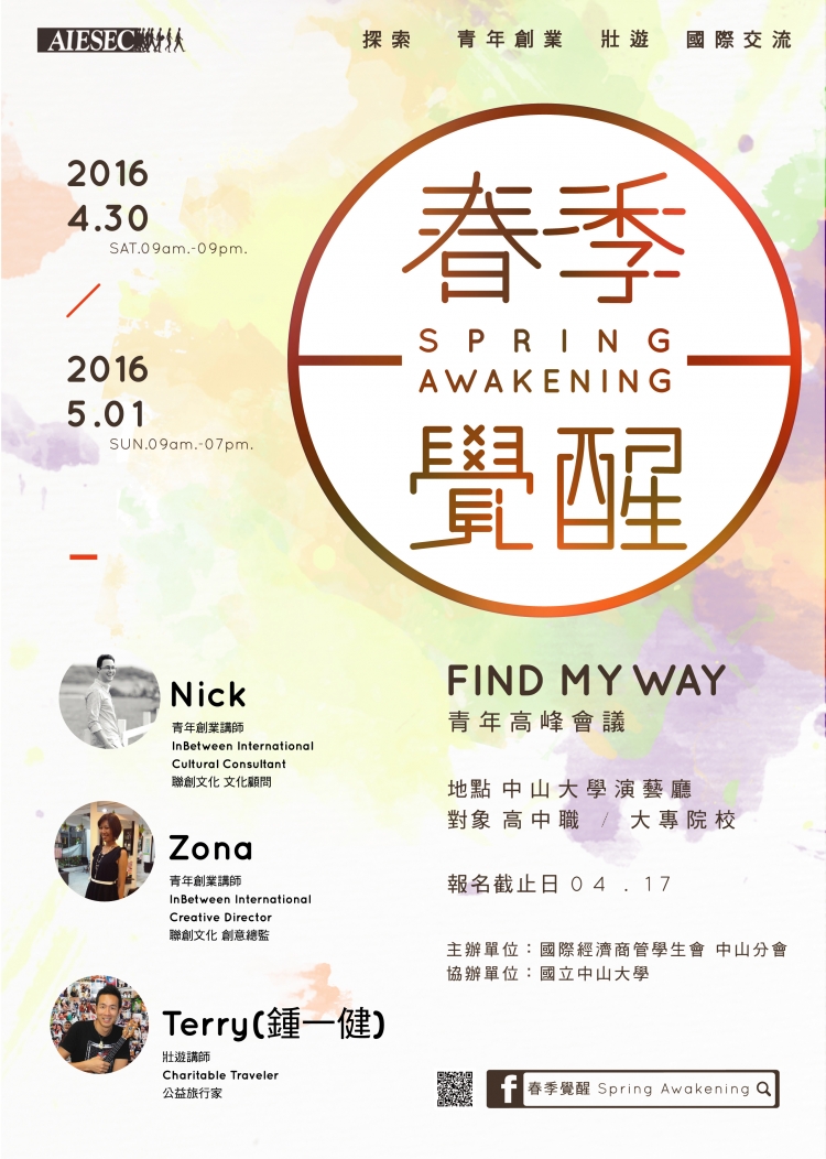 粉絲專頁:https://www.facebook.com/aiesec.nsysu.spring.awakening/?fref=ts