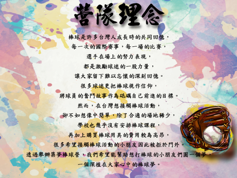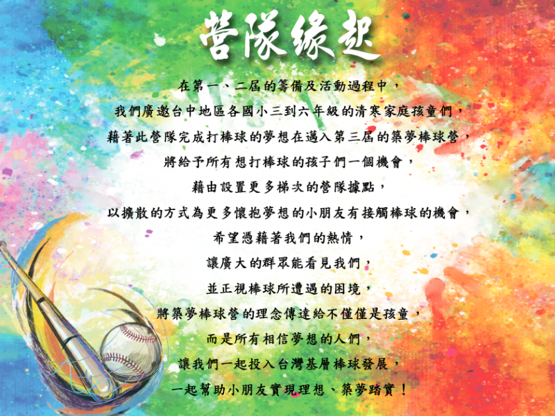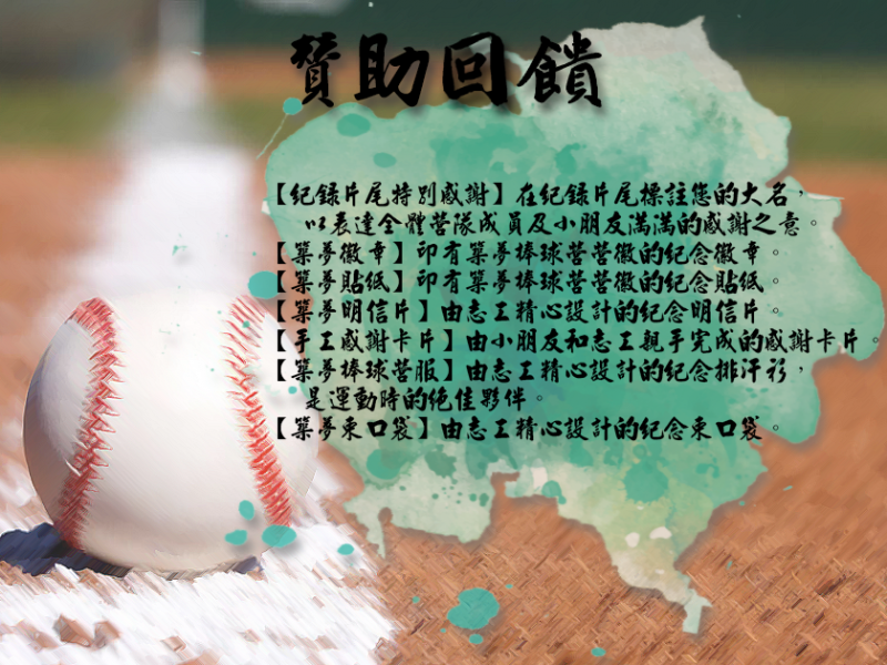 • ・贊助回饋贈品將於營隊結束後二十一日內(2016年7月25日)寄送。 ・國內運費已包含在贊助金額內,國外贊助者將另行聯絡寄送與運費計算方式。 ・本營隊無提供贈品維修與保固,但若贈品出現非因人為行為所造成之損害,請您與我們連絡,我們將會為您換貨。 ・主辦單位保留修改、變更活動細節與回饋贈品設計之權利,並有權對本活動所有事宜作出解釋或裁決,若有重大變更將事先公布於官方網站上。 ・本活動因故無法進行時,主辦單位保留終止或變更本活動內容之權利(例如:遇颱風時,營隊將視情況改期)。 ・若有任何問題,歡迎至築夢棒球營官方網站、粉絲專頁、FlyingV留言、寄送E-mail詢問(dreambaseballcamp@gmail.com)或電洽 - 總召 0928249386 許登貴 詢問(因志工們都還是學生,請盡量於下午五點下課後來電),感謝!
