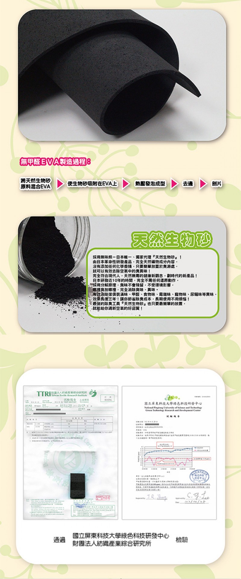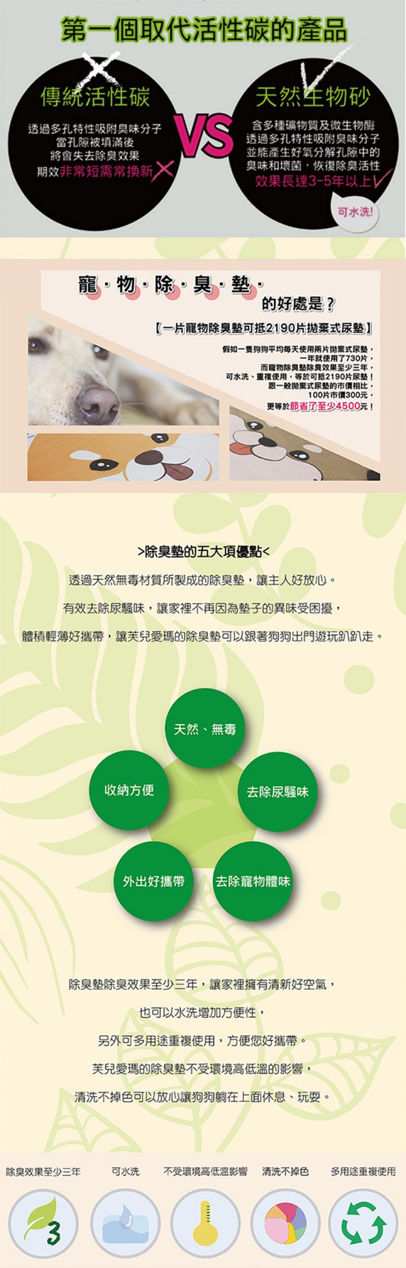 天然生物砂 - 含多種礦物質及微生物酶,除透過多孔特性吸附臭味分子,更能產生好氧分解孔隙中的臭味和壞菌,恢復除臭活性,效果長達1年以上!(且可水洗)**內文附相關除臭測試報告