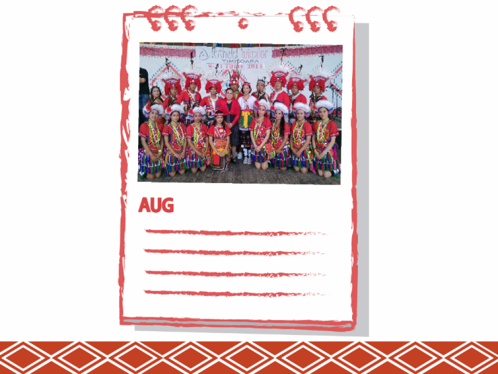 在民俗藝術節中,各國團隊以不插電的形式詮釋民族的樂舞。台灣原住民族有傳統、動聽的口簧琴及打擊的木鼓、竹鍾、竹節等,呈現原汁原味各族的樂舞。因沒有專業的舞蹈教室,我們利用附近公園,並在經費有限下借用長億體育館練習、綵排;道具與服飾也以純手工DIY的方式製作。