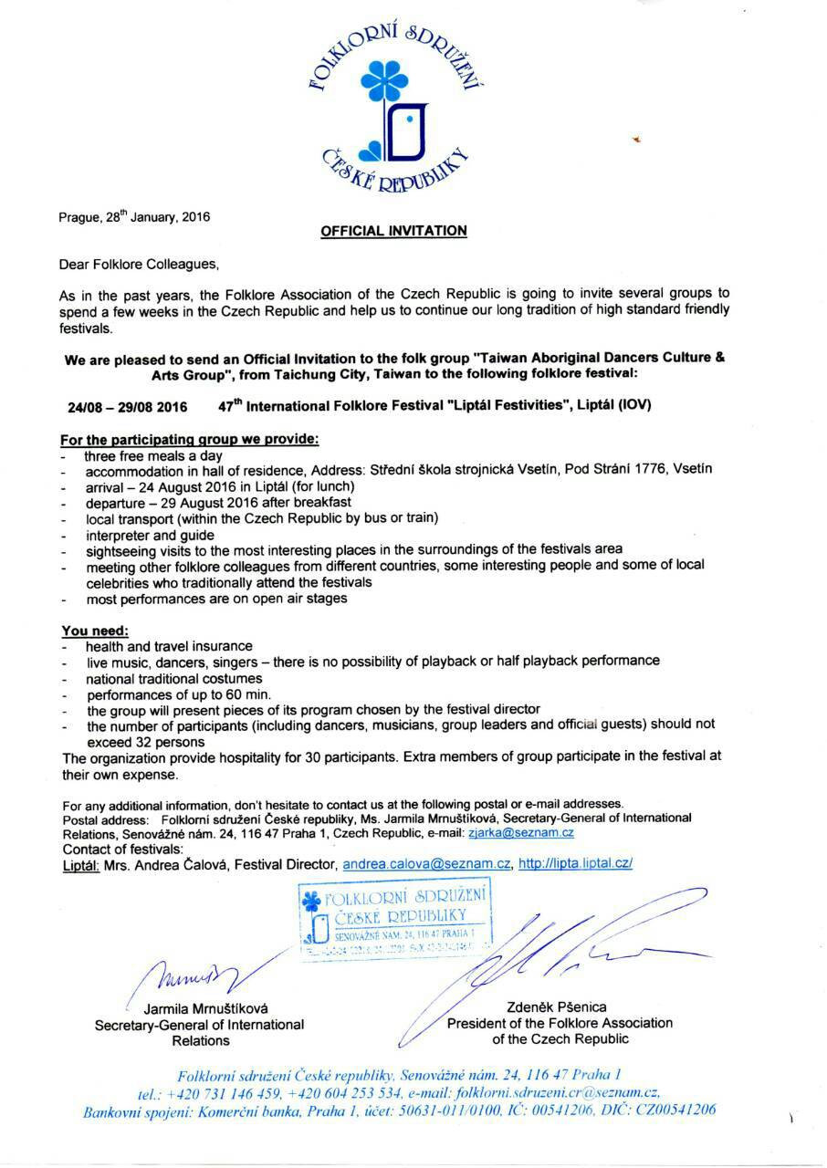 捷克國際民俗藝術節(International Folklore Festival "Liptal Festivities")由捷克民俗協會發起,今年已是第47屆,多年來彙集各國傳統民俗樂舞於捷克弗賽廷的Liptal村落,邀請義大利、奧地利、喬治亞、斯洛伐克、巴拿馬、印度等民俗樂舞團,進行為期一週的藝術節活動,內容包括地方義演、廣場演出、踩街活動及各國間文化的交流等,原舞曲文化藝術團將於2016年8月代表台灣原住民族參與此次國際盛會,宣揚台灣傳統文化之美。