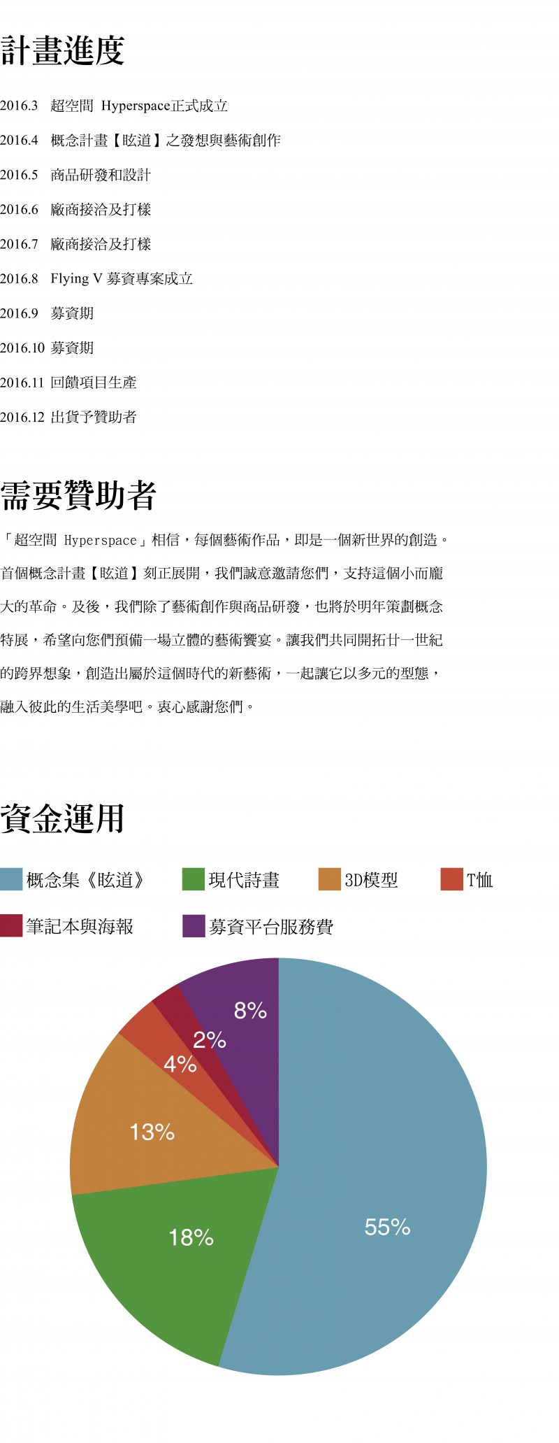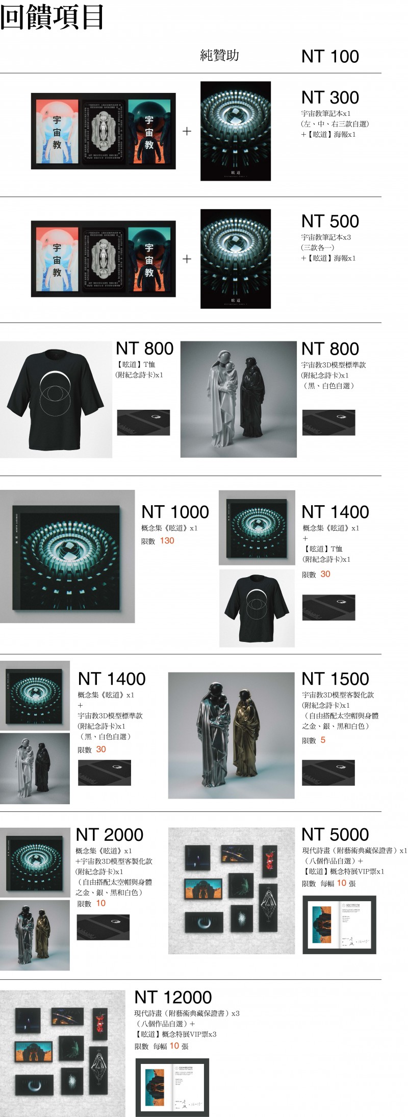2.項目回饋將於募資結束後執行,預計於12月全數寄出。 3.回饋項目之贊助金額並未包含運費,寄出服務不限任何國家地區。 4.更多資訊歡迎瀏覽FB粉專:超空間 Hyperspace。 5.如有查詢,歡迎致函hyperspace.taiwan@gmail.com。