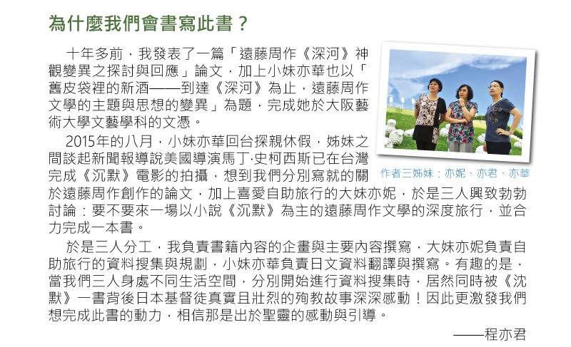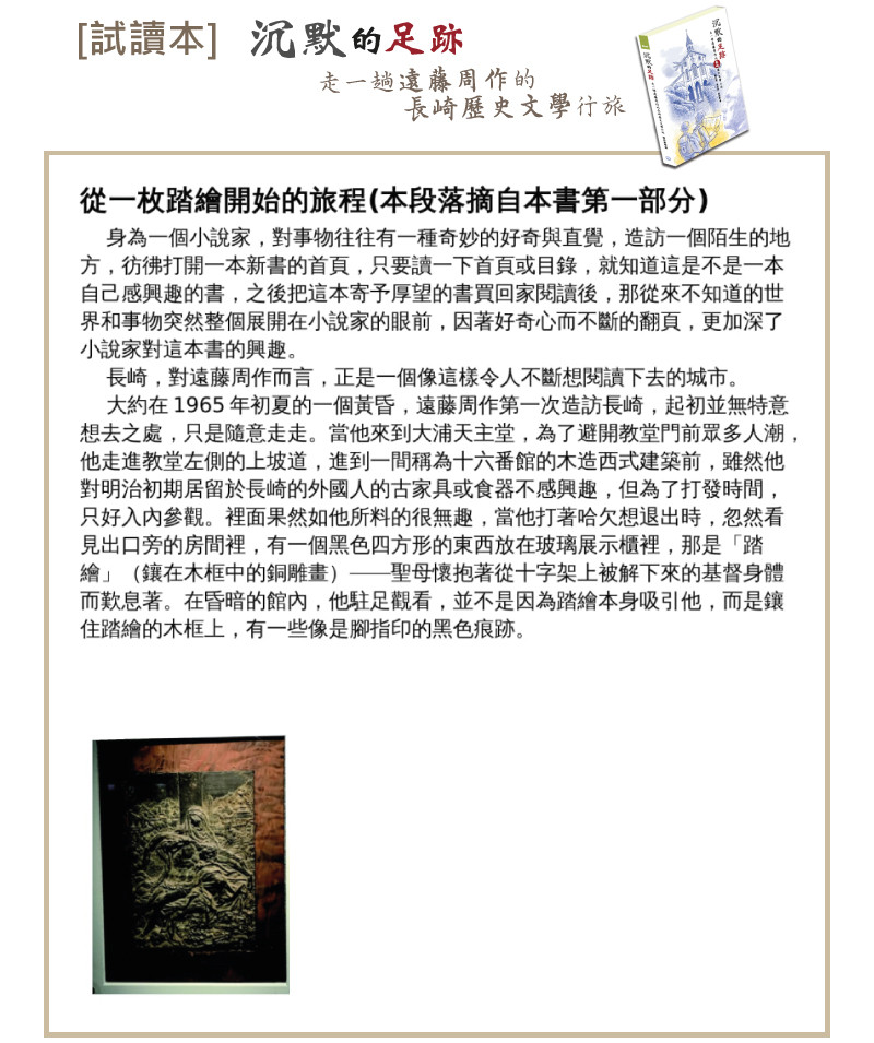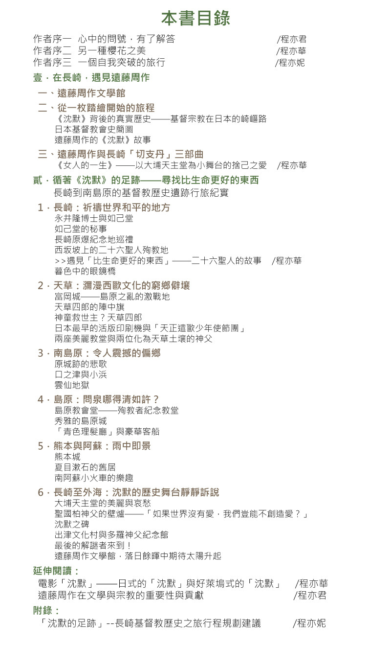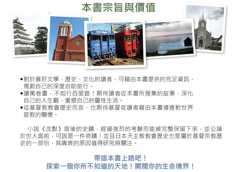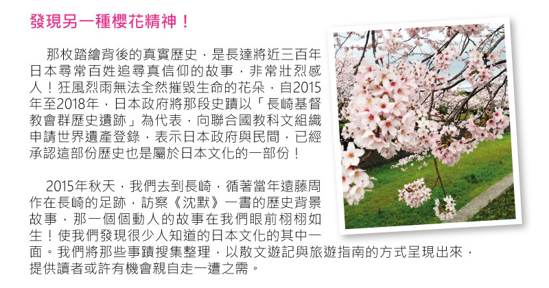 • 因為 我是以傳福音的心情來執行這個提案 所以 一定會盡心盡力地完成這個贊助出版計畫 我會 在此書出版進行過程中,不定時與您分享進度 我會 在募款終止前就開始將《沈默的足跡——走一趟遠藤周作的長崎歷史文學 行旅》這本書付梓 這樣 我就可以在募款結束時儘可能快速的將書本寄出 希望 能藉由您的參與,將本書中所闡述的感人故事與實用旅遊資訊,分享給更多讀者 感謝您的支持!