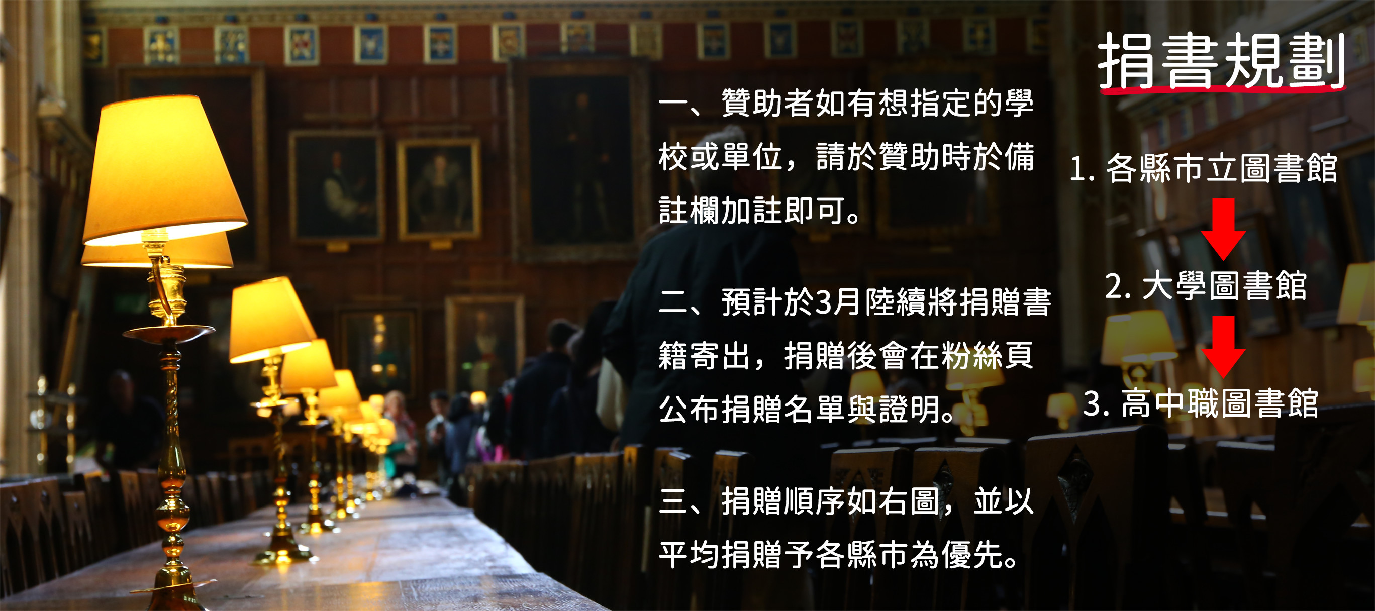 A1 : 本提案主要是希望能贊助我們出版,回饋給大家本書作為收藏;捐書,則是本提案中額外的選項,也就是出版為主、捐贈為輔。