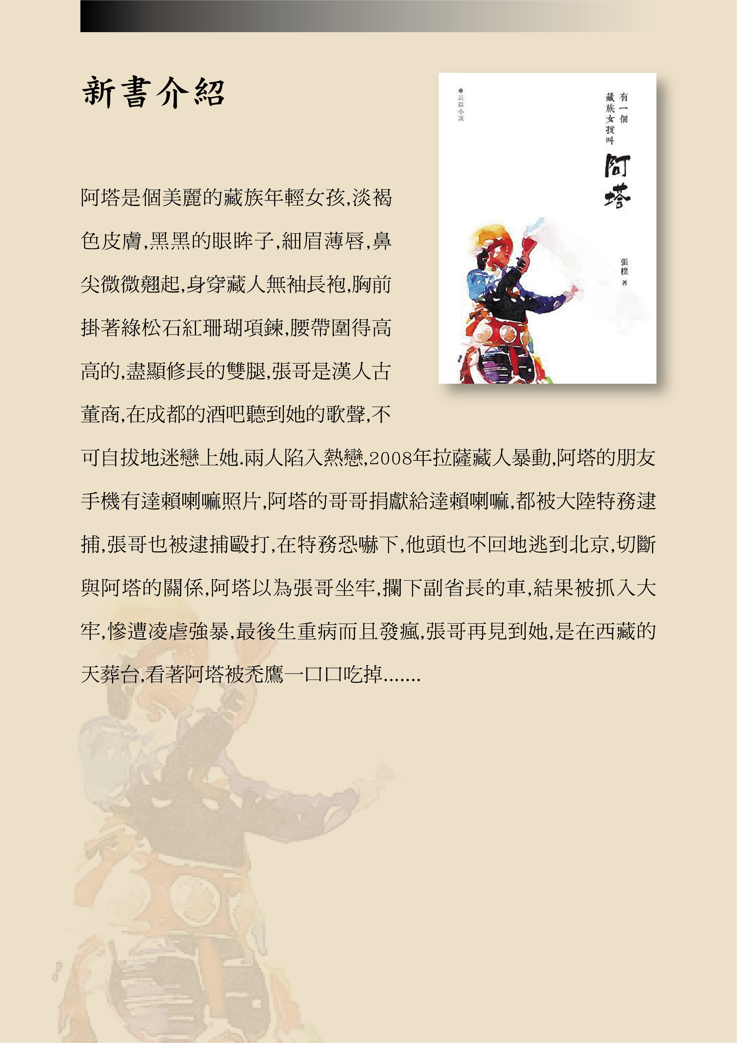 《有一個藏族女孩叫阿塔》這本書,是張樸在成都生活期間,親身經歷的故事,也是世界少數描寫漢藏愛情的小說,把我們帶到遙遠的四川和西藏,體會這段愛情故事的甜蜜和哀傷.........