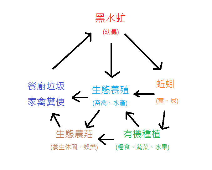 這計劃源自大自然無浪費的想法,就是蟲蟲分解廚餘,蟲糞肥種植蔬菜,蔬菜給人吃,剩菜再給蟲吃,而蟲再給雞吃,人再吃雞,如此生態循環,農場自給自足,低污染,所生產出的蔬菜,家禽都是有機養成。