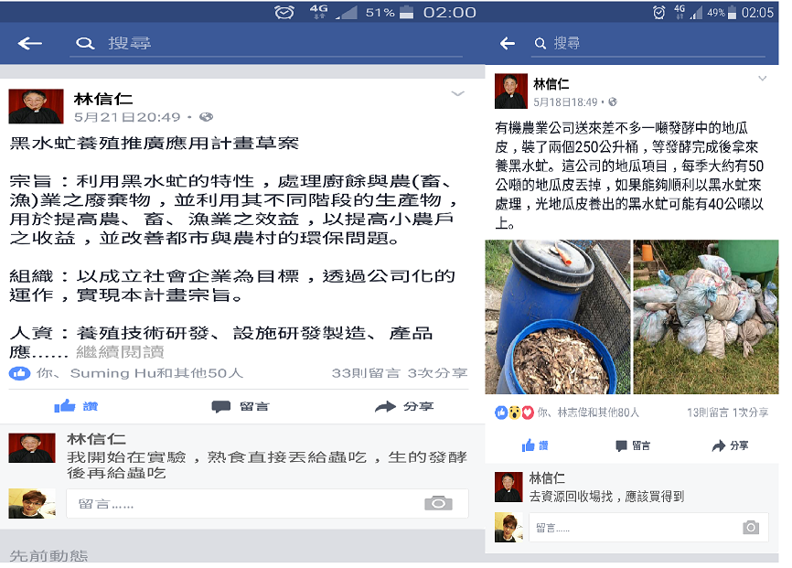 我們實際運用黑水虻及蚯蚓的腐食性,進行小型人工養殖的技術,已經能有效將廚餘,家禽糞便,過期食品,較高效率的消化,快速分解,轉化為天然有機肥用來改良土壤酸化,提供作物多元養分和豐富維生物菌種,讓作物更健康,增加植物抵抗病害,活化土壤保持通氣性,對植物根部生長有益。
