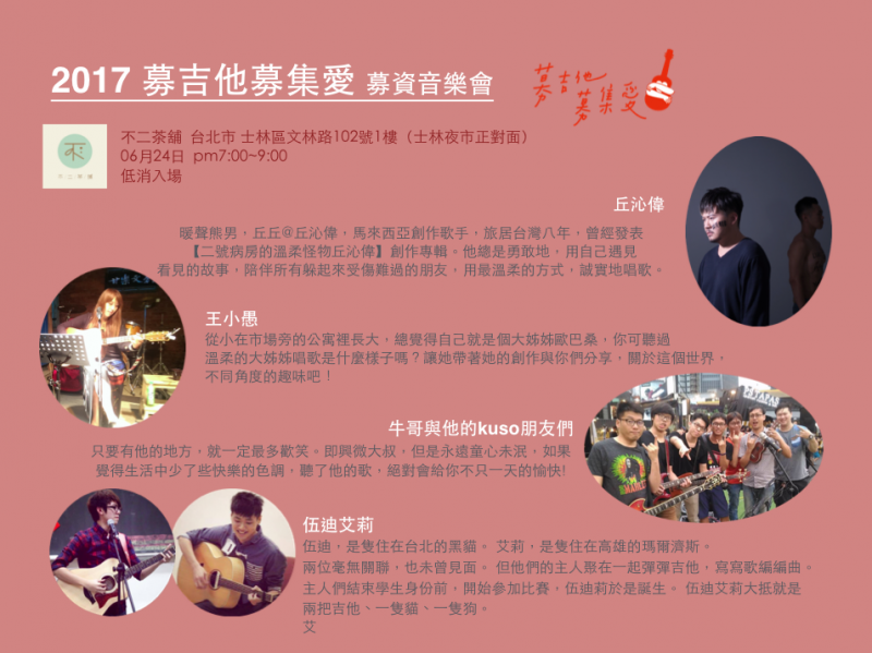 時間:6/24 晚上7:00~9:00 地點:士林 不二茶舖 (捷運劍潭站步行五分鐘)地址:台北市文林路102號低消入場當天會有四組精彩的演出現場也有好喝的現泡茶與現烤麵包另外也會準備很多義賣小物~當天限量特價販售義賣商品當天會直接透過flyingV平台捐出唷!