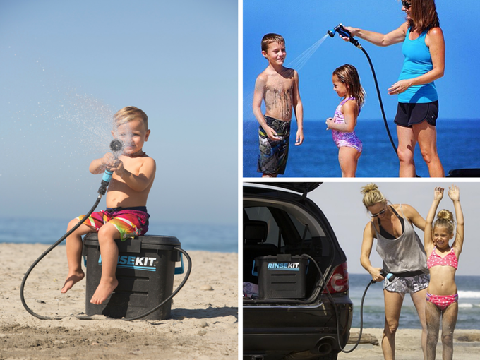 RinseKit 水立沖設計七種不同出水選項可以讓使用者更有效率的使用水 ,以及183公分長的軟管 ,可分離式的上蓋可以用來站立 ,方便清洗髒污或是滿是沙的雙腳或是用來衡量魚的長度(上蓋同時附有量表) ,最後 ,RinseKit 水立沖內部空間還可以放置濕的泳衣 , 防曬乳或是更多外出小物 .