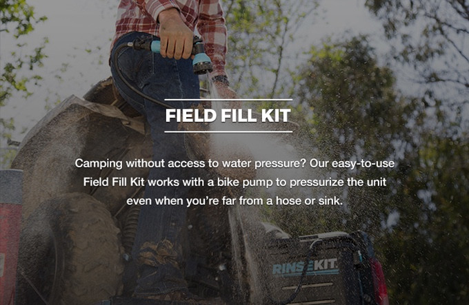 戶外水壓和注射套件可以幫您解決問題,即使在沒有水龍頭的環境裡依然可以完成注水,再使自行車打氣筒為RinseKit儲水室加壓,即可馬上使用.