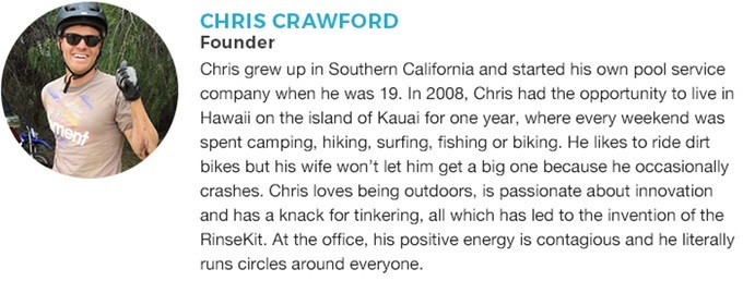 克里斯從小在南加州生活 ,2008年 ,19歲時開始了泳池服務事業 ,因緣際會下 ,克里斯到了夏威夷的考艾島( Kauai) 生活了一年 ,每個周末都花在露營 ,健走 ,衝浪 ,釣魚 ,或是騎登山車 !克里斯非常喜歡越野車 ,他老婆怕他受傷從來不答應讓他去買更大台的 ! 他非常熱愛戶外活動 ,也勇於嘗鮮並且對於新的事物非常敏銳 ,這些特質正是RinseKit被發明出來的最大原因 !在辦公室 ,克里斯的正面能量總是能夠激勵同事並源源不絕的開啟每一個人的潛能 .