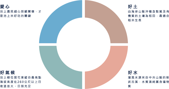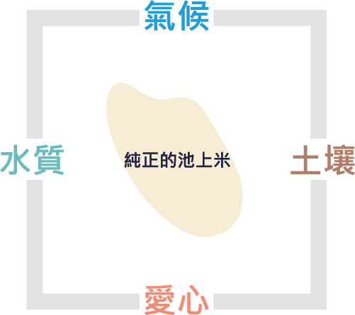台東縣池上鄉被稱為是後山的淨土,由於池上境內沒有大型工廠污染水源及土地,因此水質清澈,甘美。對於水稻的栽培來說,清澈無污染的水質及土壤,是稻米在栽種的過程中可以生長良好的重要因素,由於池上鄉位在海拔250~293公尺處,日夜溫差大,稻米的生長期長,米質特色可以完全發揮。在天然環境,氣候條件的配合之下純淨。 ,無污染的生長環境,加上優良的天候條件配合,使池上鄉成為適合栽種水稻的地區。