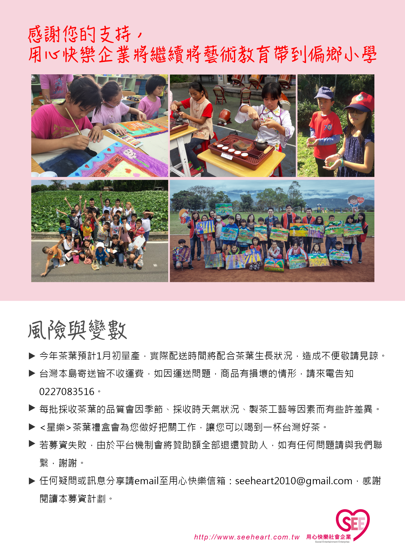 • 任何疑問或訊息分享請email至用心快樂信箱:seeheart2010@gmail.com,感謝閱讀本募資計劃。