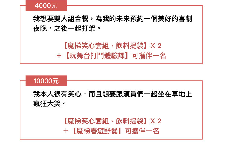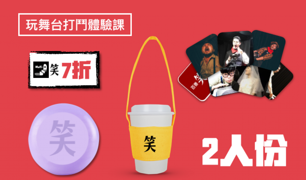 【魔梯笑心套組、飲料提袋】X 2 +【玩舞台打鬥體驗課】可攜伴一名 我想要雙人組合餐,為我的未來預約一個美好的喜劇夜晚,之後一起打架。