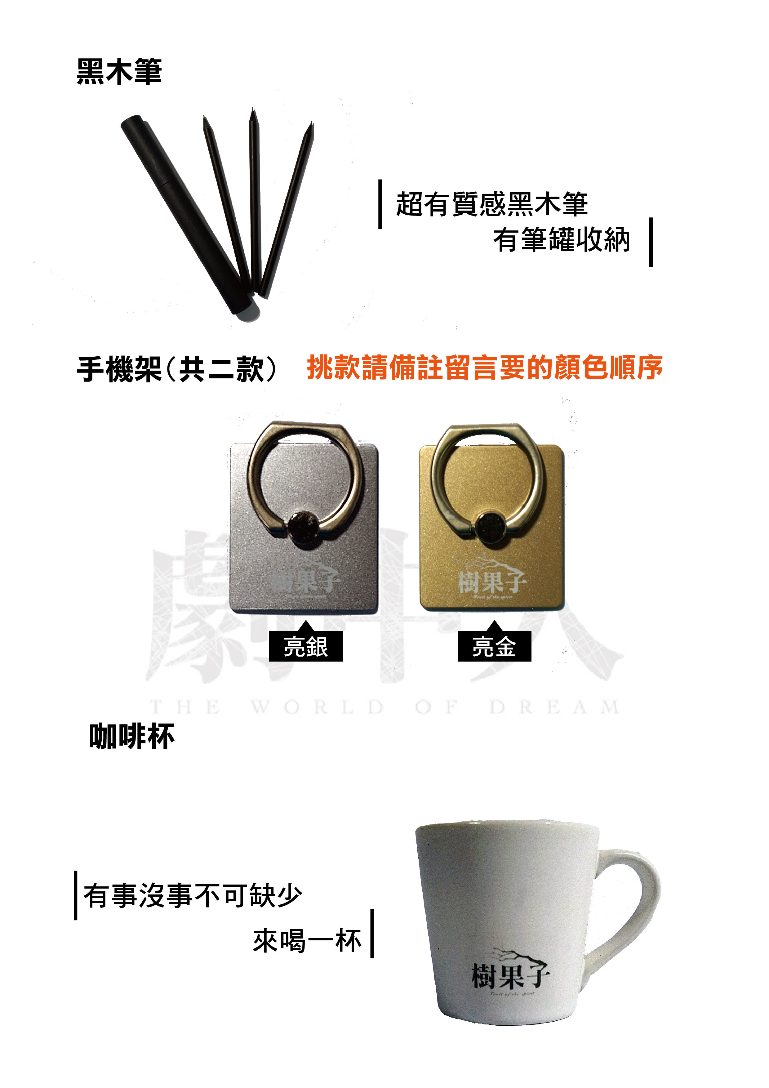 胸章1個+鏡子1個+黑木筆1組+手機架1個+咖啡杯1個