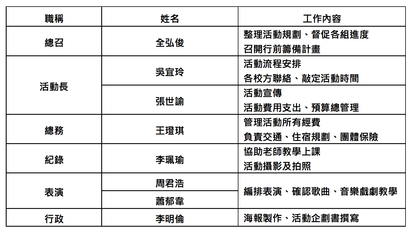 透過我們的活動給孩子們開心、快樂的一天,讓孩子們體驗表演的感覺並給予他們鼓勵,增加孩子們的信心,同時也學習到團隊合作的精神與凝結向心力的重要,也在他們的生命中種下一顆新的種子,讓他們知道未來其實有更多的可能性,不要被任何框架侷限。