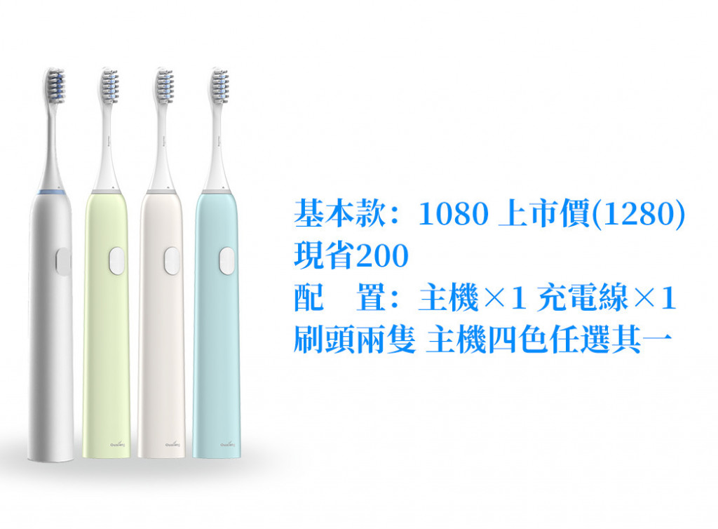 眾籌價 基本款:1080上市價(1280)現省200 配置:主機*1 充電線*1 刷頭兩隻 主機四色任選其一
