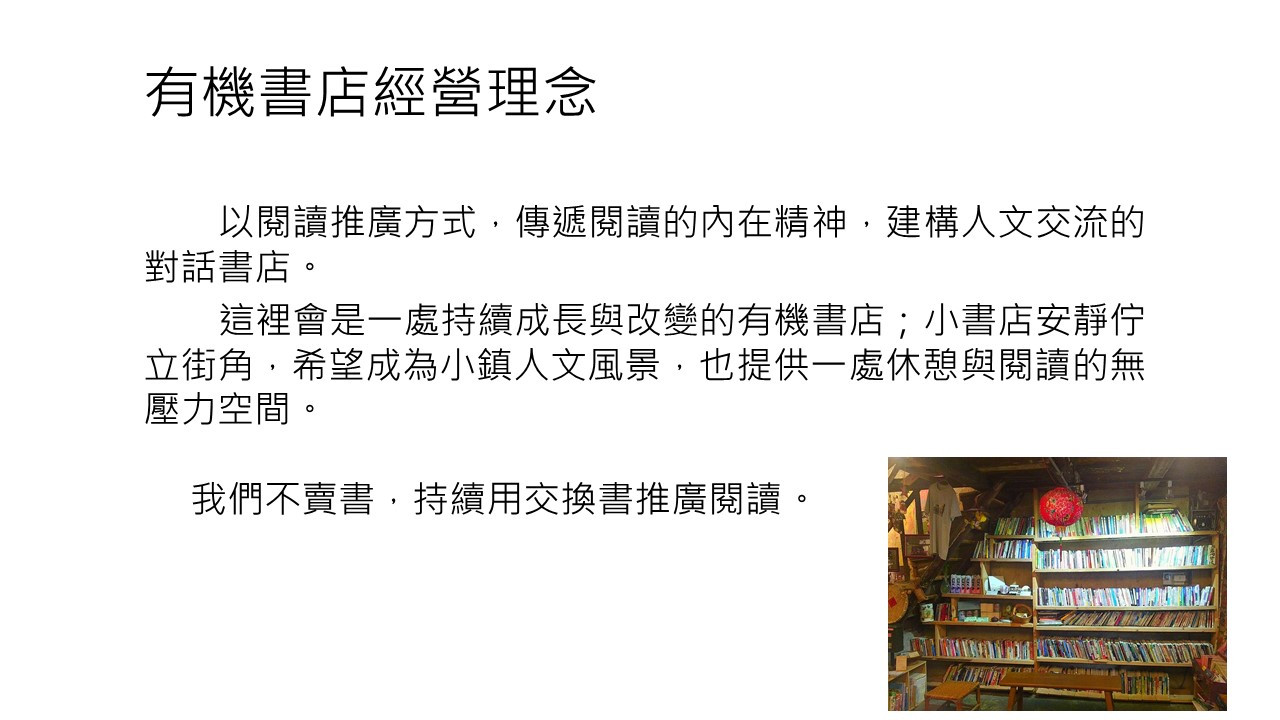 實體書店在現今的社會中的生存一直是被關注的問題,一家書店單純靠書籍銷售很難營運下去,走向複合式的經營模式才有可能存活下來,有機書店是一家不賣書,用交換書推廣閱讀的書店,交換書的方式單純是想讓閱讀的門檻降低,而且有機書店只選擇開在偏鄉,目的只是想給鄉下孩子們同樣的閱讀機會。