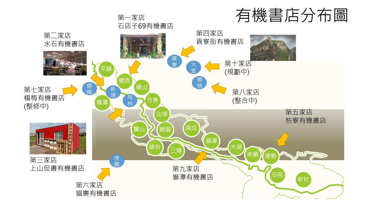 目前有機書店共有六個據點,包括三家實體書店(新竹關西的石店子69有機書店、新竹新埔的水石有機書店、新北市的貢寮有機書店)以及三個漂書站(芎林的上山侃書有機書店、東勢的枋寮有機書店與苗栗的貓裏有機書店)