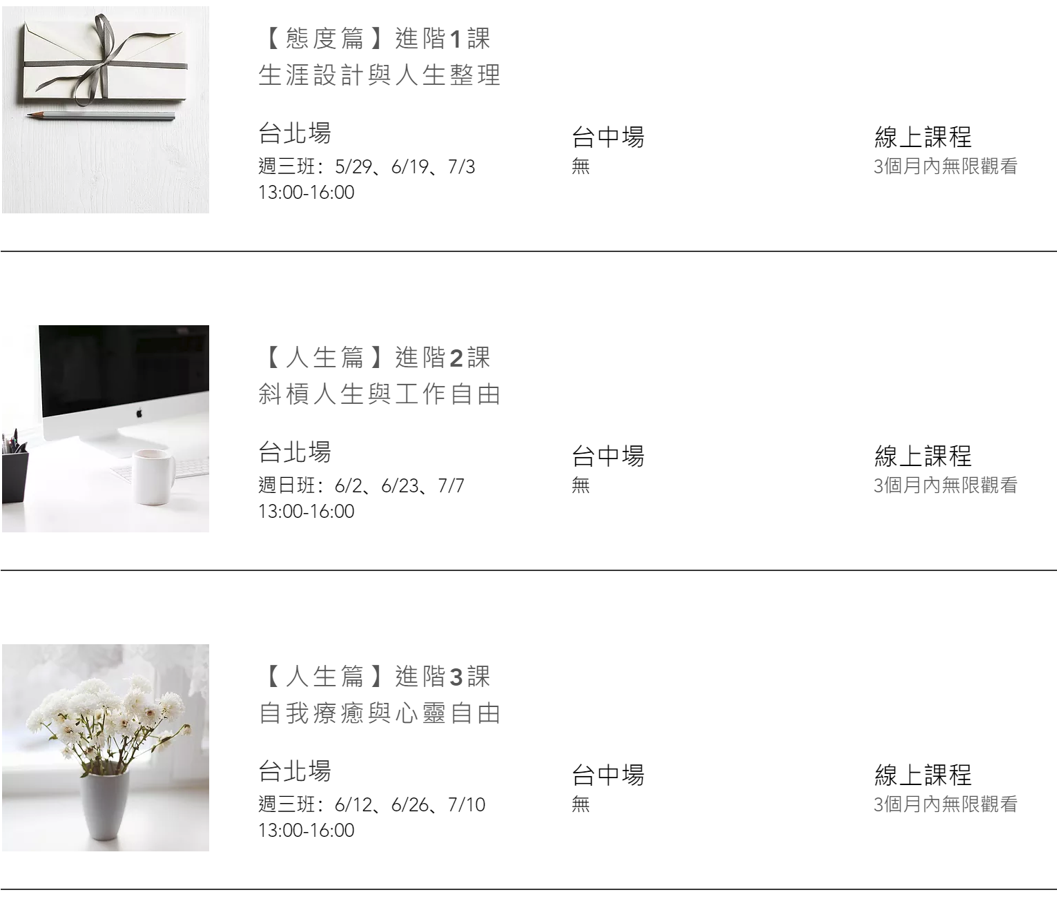 • 實體課程與線上課程亦有『台北場』與『台中場』