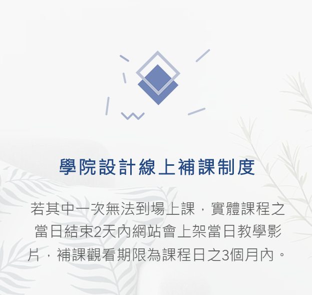 5.報名實體課程之學員亦享有線上補課制度,與報名線上課程之學員均享有當日課後(2天內上架當日課程影片)3個月內無限觀看影片之權利。