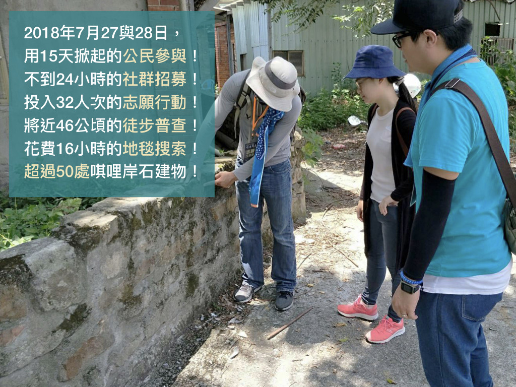 - 2018年7月26日,透過網路社群發佈「搶救唭哩岸石!」資訊,募得超過20位的志工。
