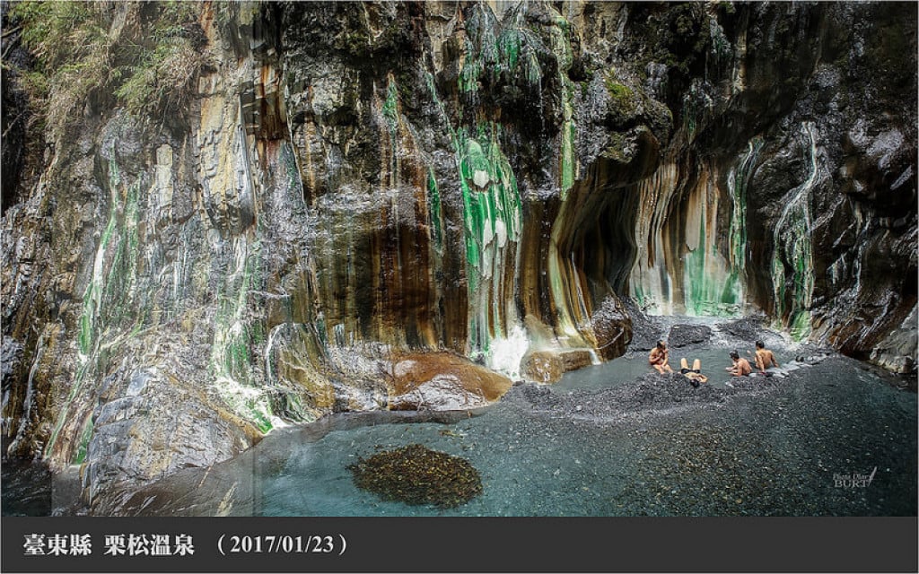 栗松野溪溫泉: 依偎著台東新武呂溪峽谷山壁上的栗松溫泉,是台灣最美的景點之一。許多溫泉迷早已聽說了這個地方(此地也稱為摩天溫泉),但是大多數民眾卻從未所聞。雖然地處偏僻,不過卻非常適合健行探訪。