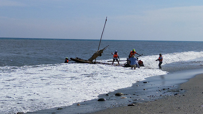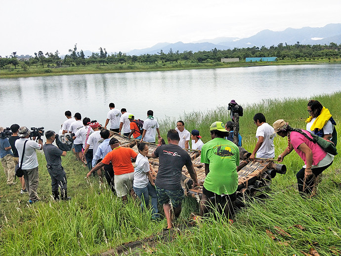 圖說:眾人合力將仿古竹筏檯入河道測試船體