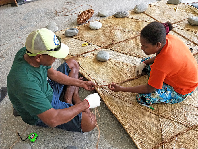 與熟悉古代航海技術的索羅門群島友人,一起製作風帆、船體交換心得,。