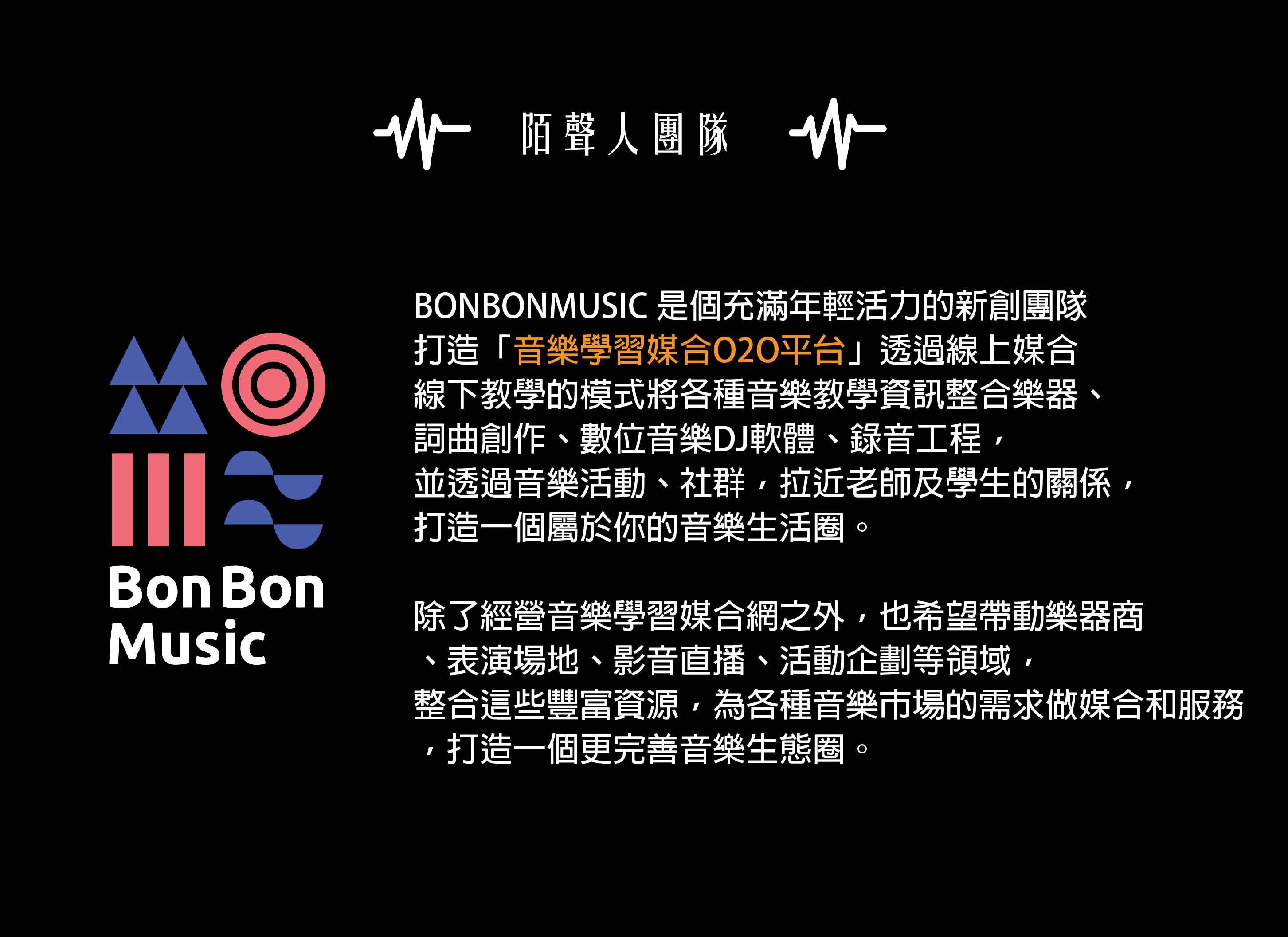 BonBonMusic是個充滿年輕、活力的新創團隊,打造「音樂學習媒合O2O平台」,透過線上媒合線下教學的模式,將各種音樂教學資訊整合,幫助音樂老師找到自己的課程定位與差異化,透過清楚的課程資訊與老師經歷數據,精準的讓各種音樂學習需求的人都可以在不同的階段所需,找到最適合自己的老師。 不論是學樂器、作詞作曲、數位音樂、DJ軟體甚至是錄音工程,在這都能找到各地屬於你的音樂課程,並且透過音樂活動、社群,來拉近老師及學生的關係,打造一個屬於你的音樂生活圈。