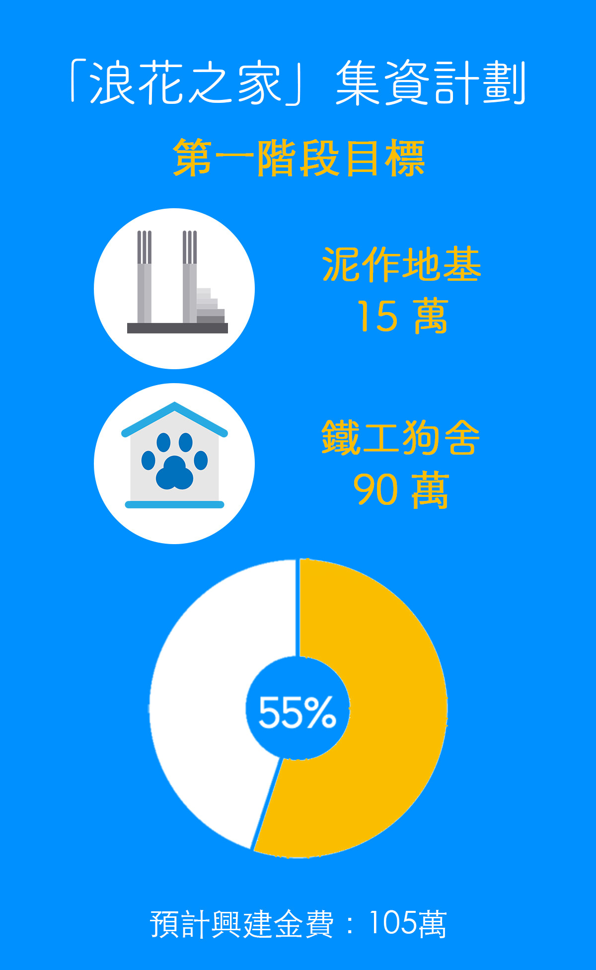 第一階段目標:50萬元(目前已開始泥作地基、興建狗舍階段)