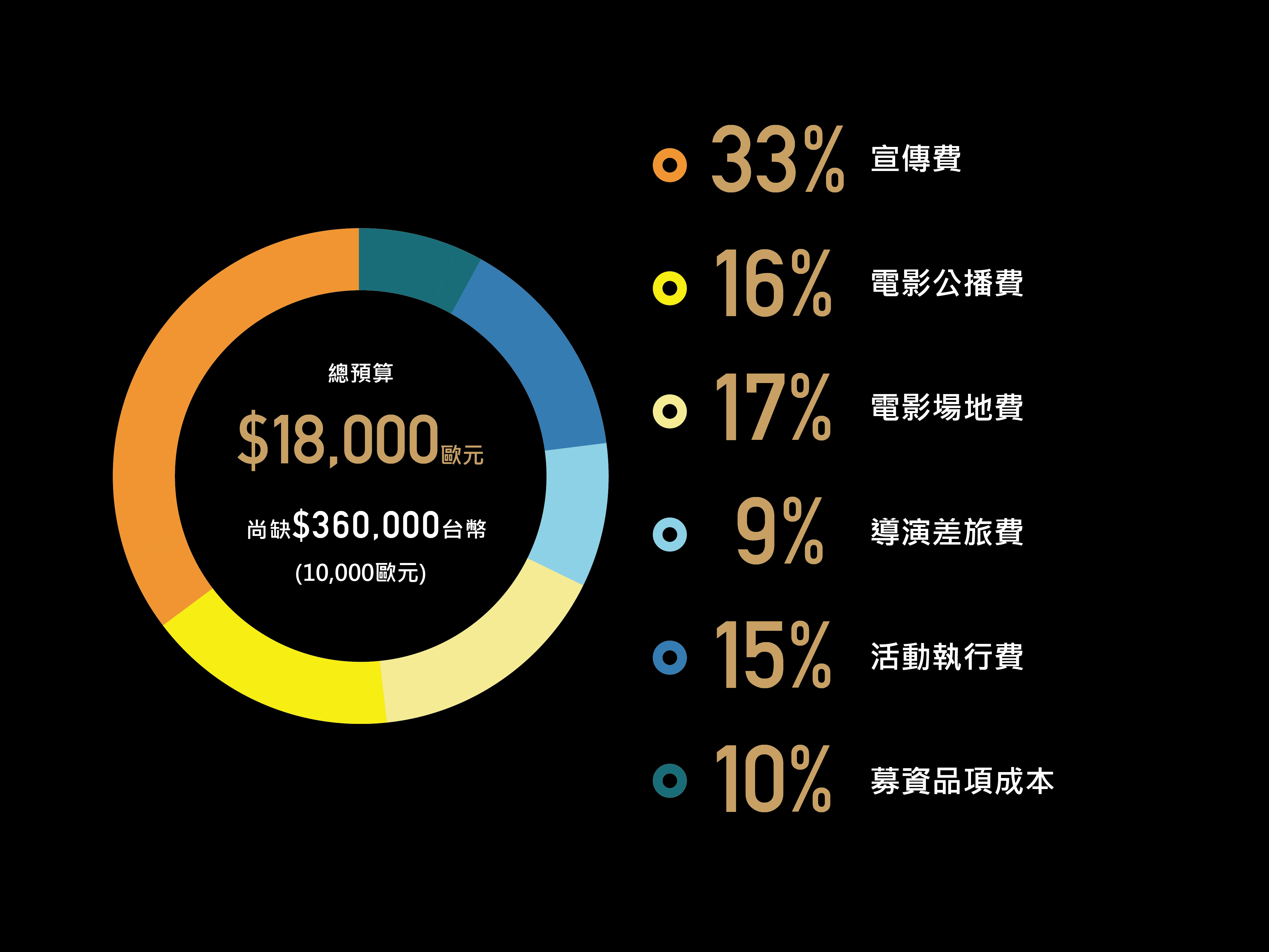 經過團隊的努力,活動已受到台灣文化部及慕尼黑阿里山旅行社贊助總預算56%,會先用來支付前期的場地費、公播費及導演的機票和住宿費用,而募資所獲得的款項,主要會支付後期的宣傳和執行費用。