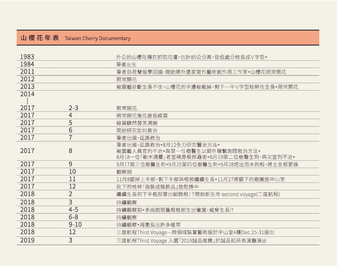 我一直很想卯起來跟人介紹「三度航程」到底是怎樣的一個計劃,但實在難以三言兩語說出口,或是編織出個華彩片段、精闢扼要、足以供人傳述的「創作論述」。他在2017年無形中起草,就在外公的山櫻花樹,於2017年2月綻放了最後一次之後,他就在很短的時間之內從「一棵開花的樹」變成「木材」。短暫又深刻地,帶來最後的致意(the last bow)。