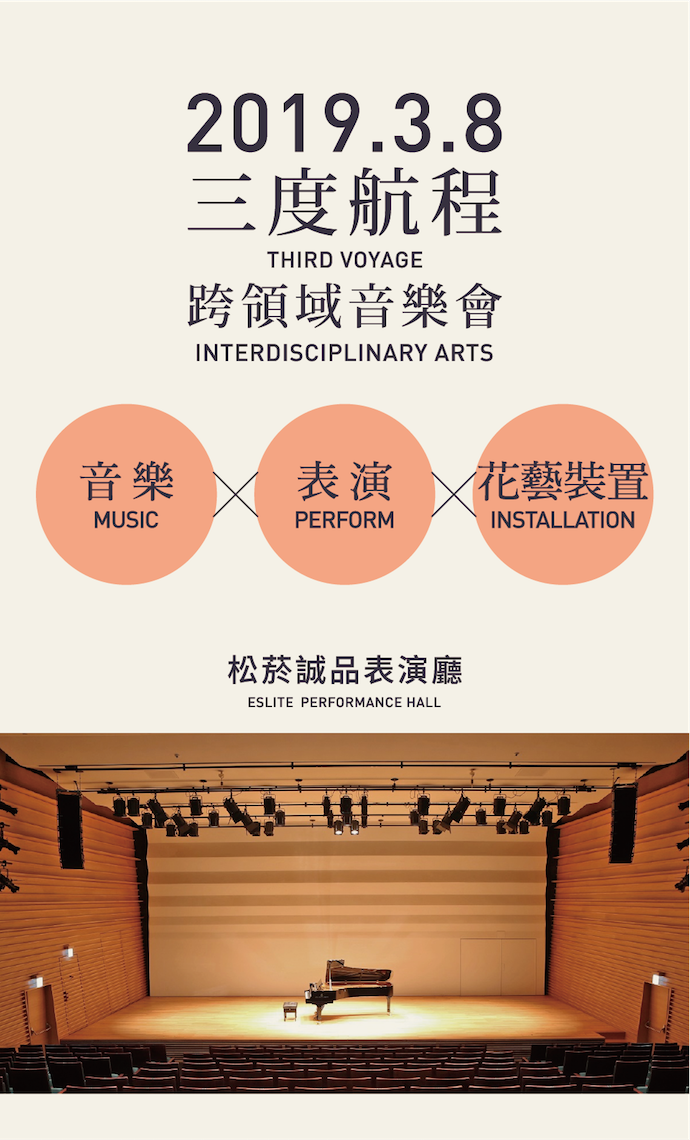 全方位表演藝術家劉郁岑在這次的「三度航程-跨領域音樂會」中擔任導演,轉化2018年版本的空間展演型態,並特邀「無事生活」花藝師吳曉柔老師讓山櫻花以另外一種形式繼續生長。「三度航程third voyage—跨領域音樂會」將創造一個全新、令人驚豔、以花藝為基底、音樂會形式為主軸的跨領域表演節目。