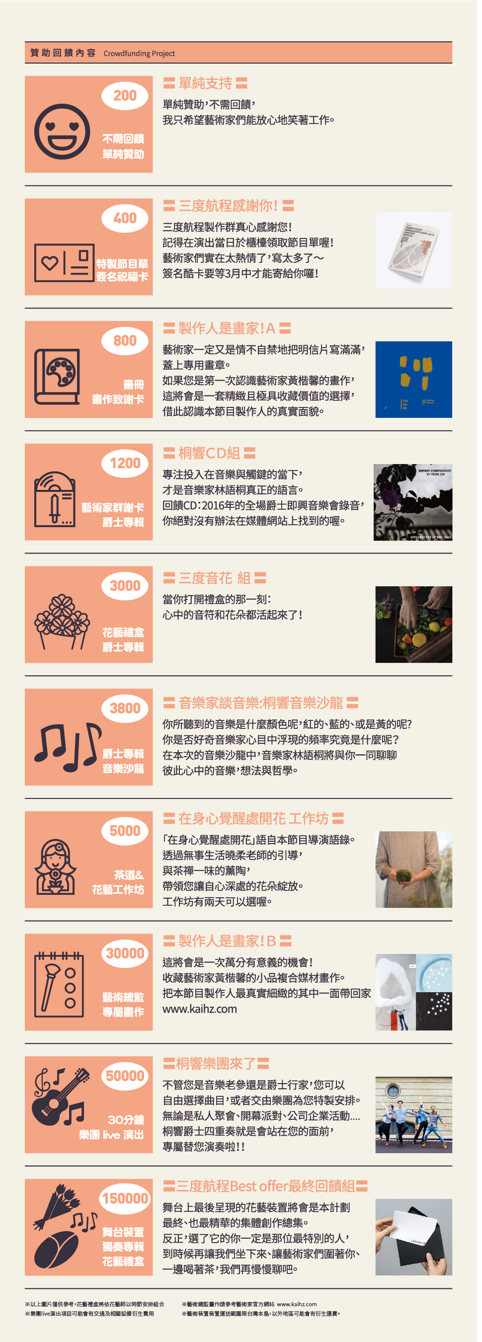礙於這此演出是對號座以及售票系統的各項繁瑣條件,我們沒有辦法在回饋項目中提供送票的選項,但為表示藝術家們對於參與贊助者的誠意與感恩心,我們在贊助回饋上提供了相當豐富的選項,同時也相當「跨領域」!希望能夠滿足每一位有意願贊助藝術家的朋友們,也期盼您以贊助作為實質行動的當下,同時帶還給自己和他人一顆溫暖的心。又,值得注意的是:雖然在3月8號的晚上「三度航程-跨領域音樂會」於誠品表演廳的節目就會演出結束了,但實際上在演出結束後藝術家們依舊還有屬於該計劃的後製工作需要持續進行,因此,該贊助計劃將會延續到節目演出結束後的3月12日,植樹節過完以後結束。雖然這是一個藝術類的表演節目,理念上我們希望一個啟始於ㄧ棵樹的計劃,也能在過完屬於一棵樹的節日後終止。於此「三度航程-跨領域音樂會」非常需要您的支持與贊助!