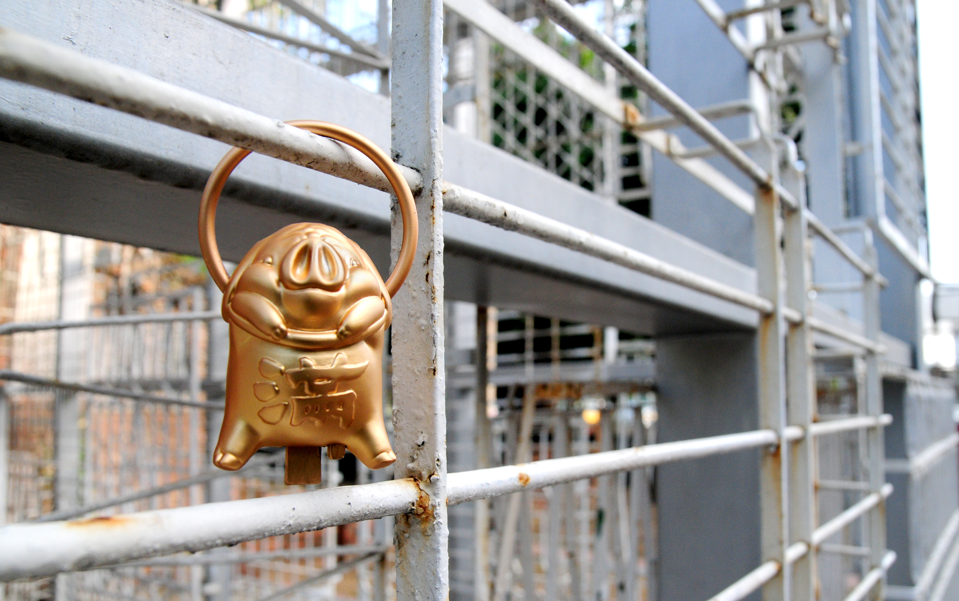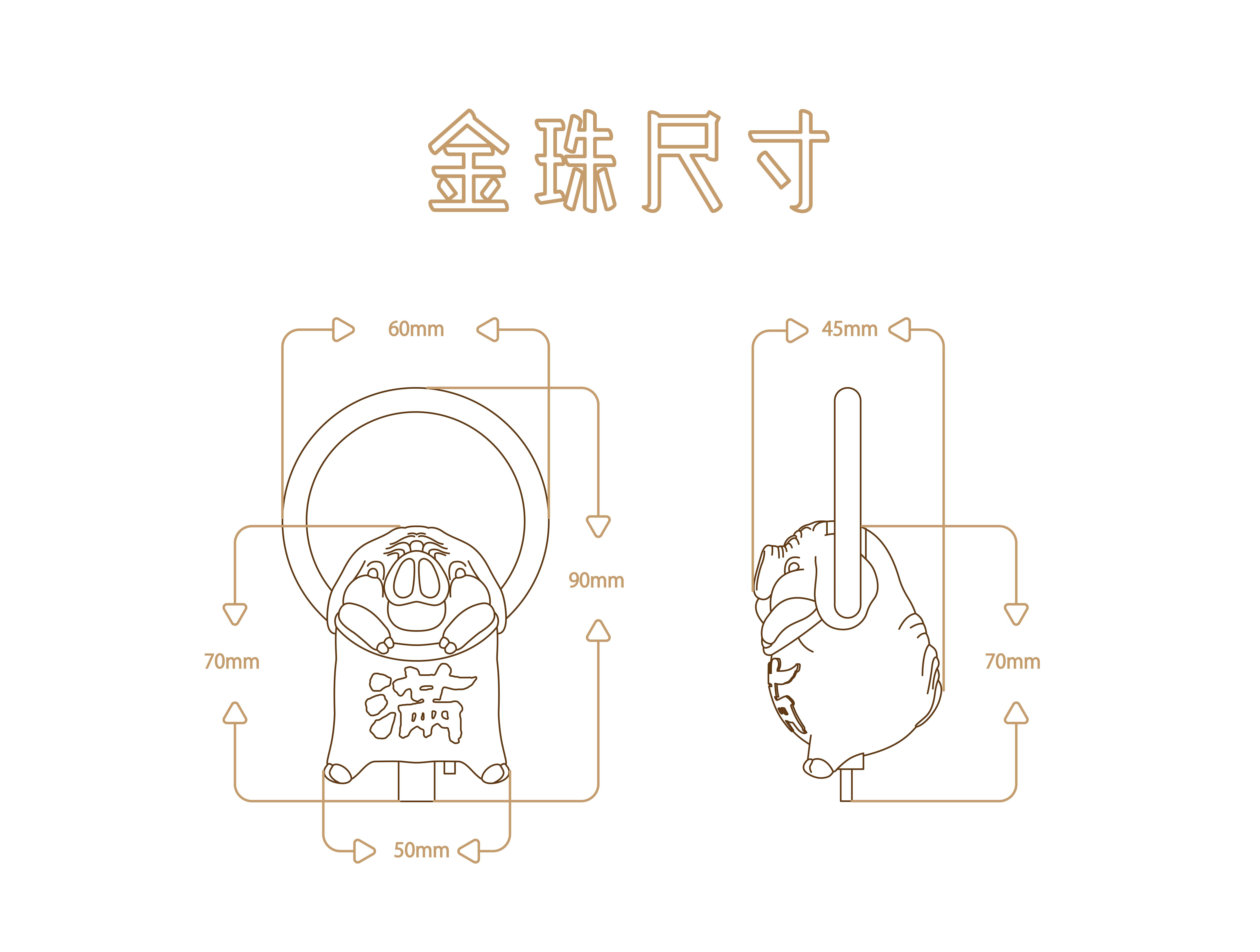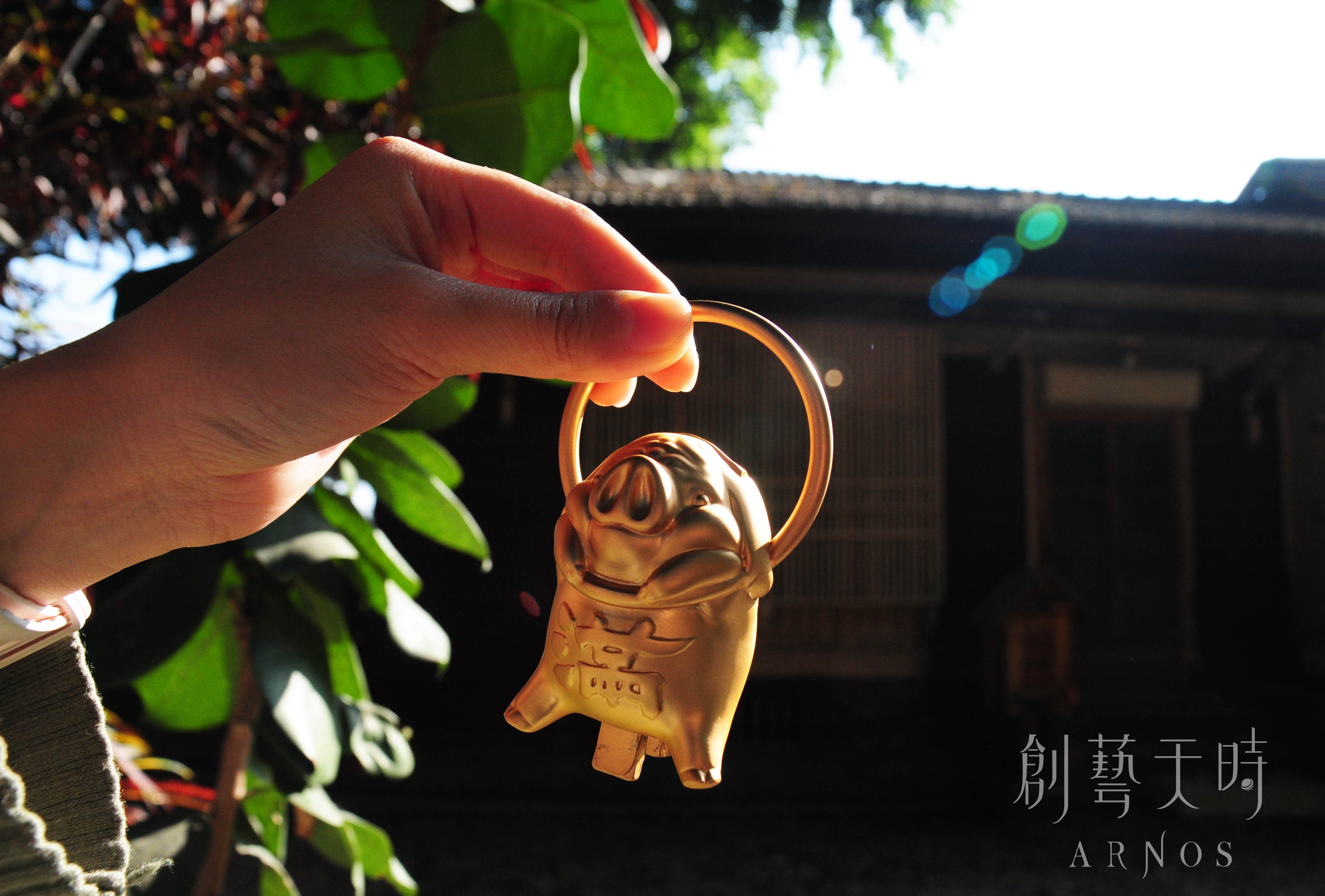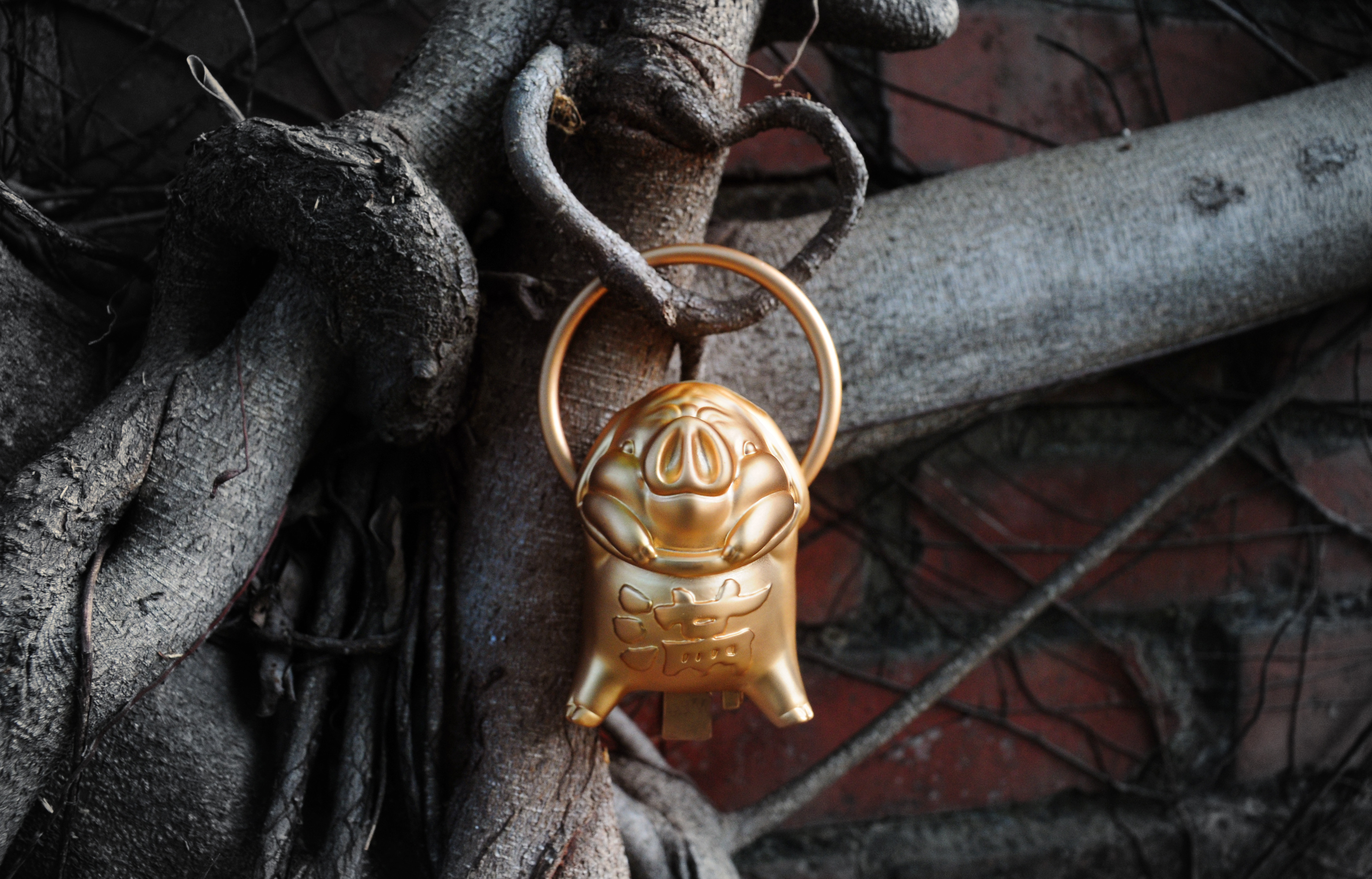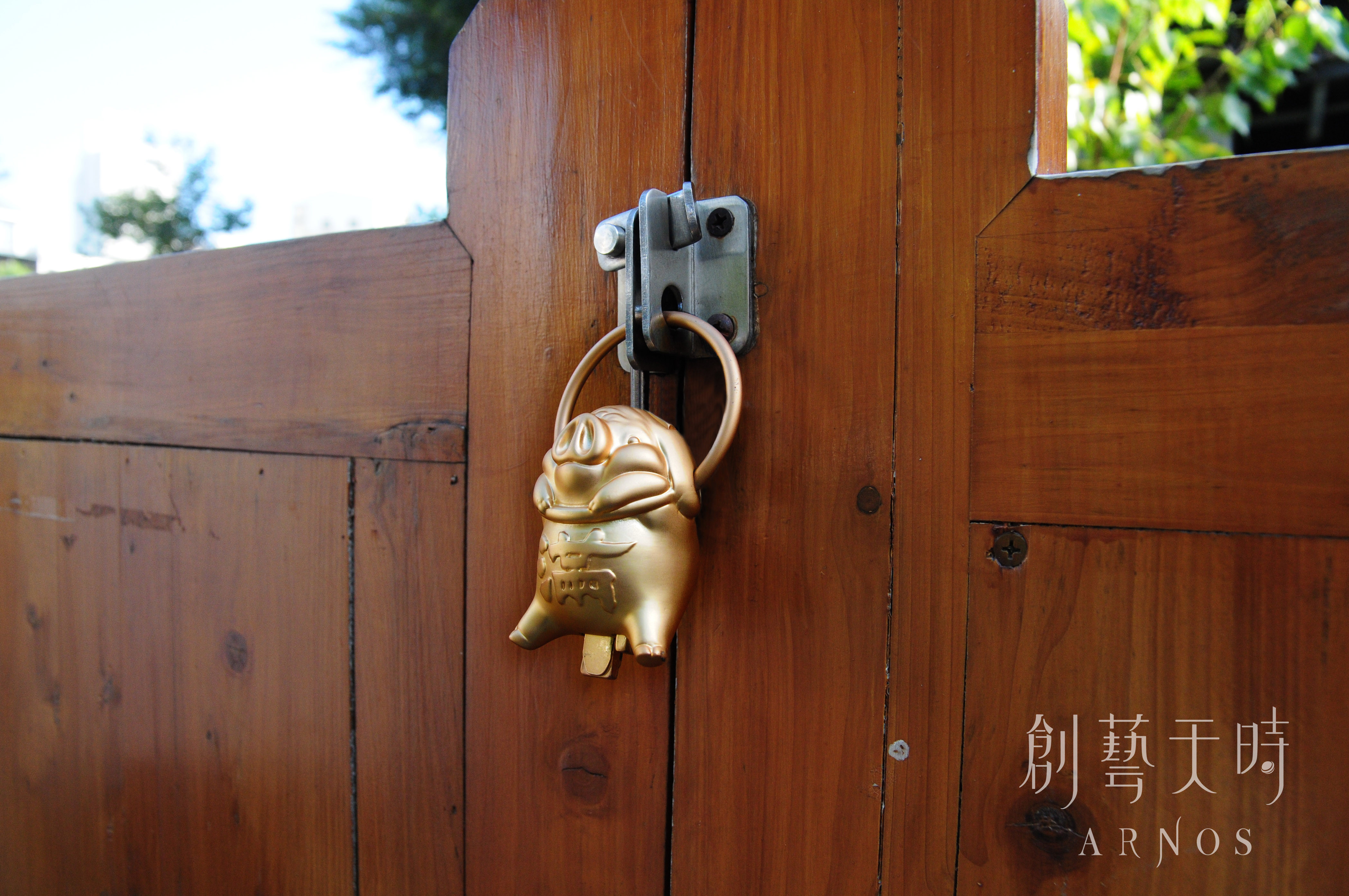 而我們這次選擇的是花旗鎖來做設計, 造型上以喜氣的春節與豬年為設計方向,以台灣家豬的原生品系桃園豬做轉化設計,小豬像吊單槓般地掛在環上,象徵福氣的圓潤身軀加上大大的垂耳,前後搖擺,給你滿滿的大肚子、短鼻子與小短腿,春節時以滿字貼在米缸、冰箱、錢筒上,象徵衣食無慮,而我們將滿融入設計希望收到的使用者新的一年都能豐收滿滿。