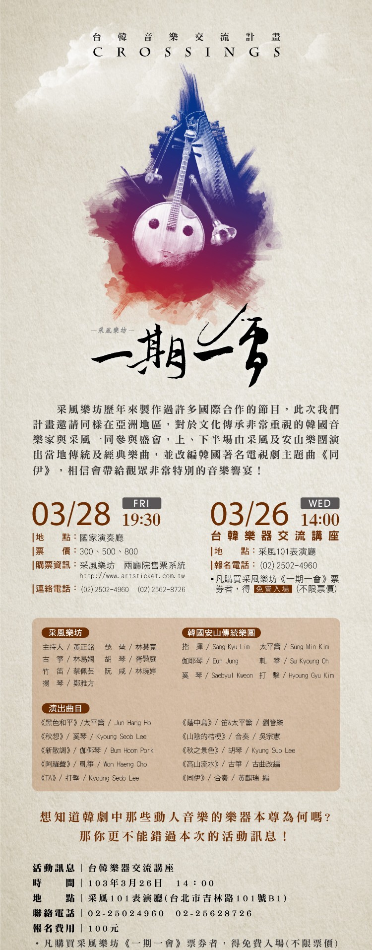 持《一期一會-台韓音樂交流計畫》票劵還能於3/26來參加【台韓樂器交流講座】喔!