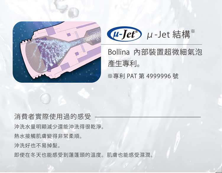 田中金屬製作所獨家專利技術研發的超微細奈米氣泡裝置「μ-Jet」,裝置於Bollina本體的底端。(專利證書:PAT第4999996號/取得國際專利:中國、韓國、美國)