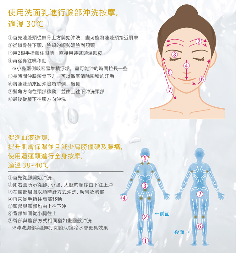 極致超微細氣泡洗淨力,肌膚含水量提升8%,肌膚表面溫度提升6倍,最大省水50%水量。