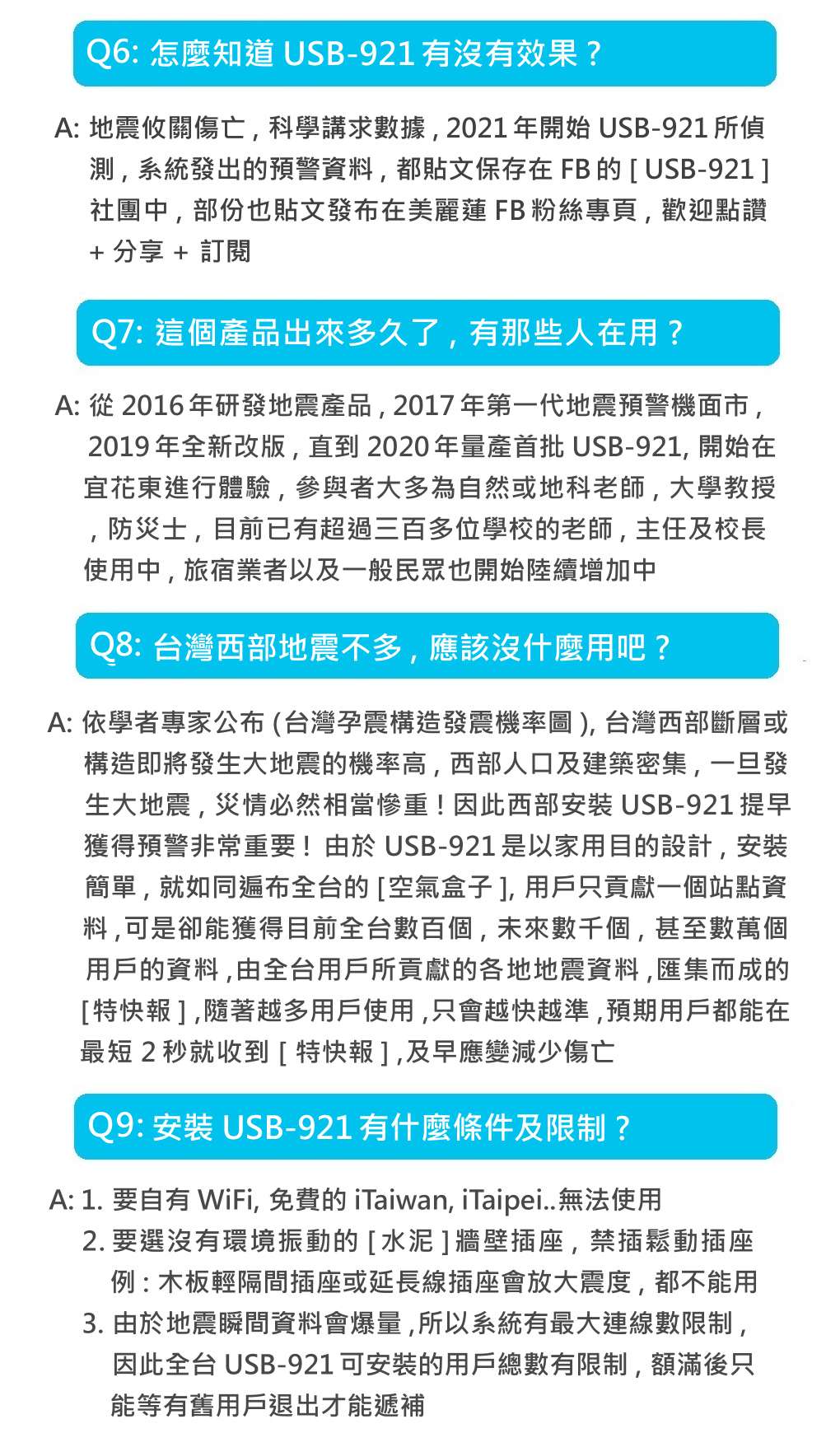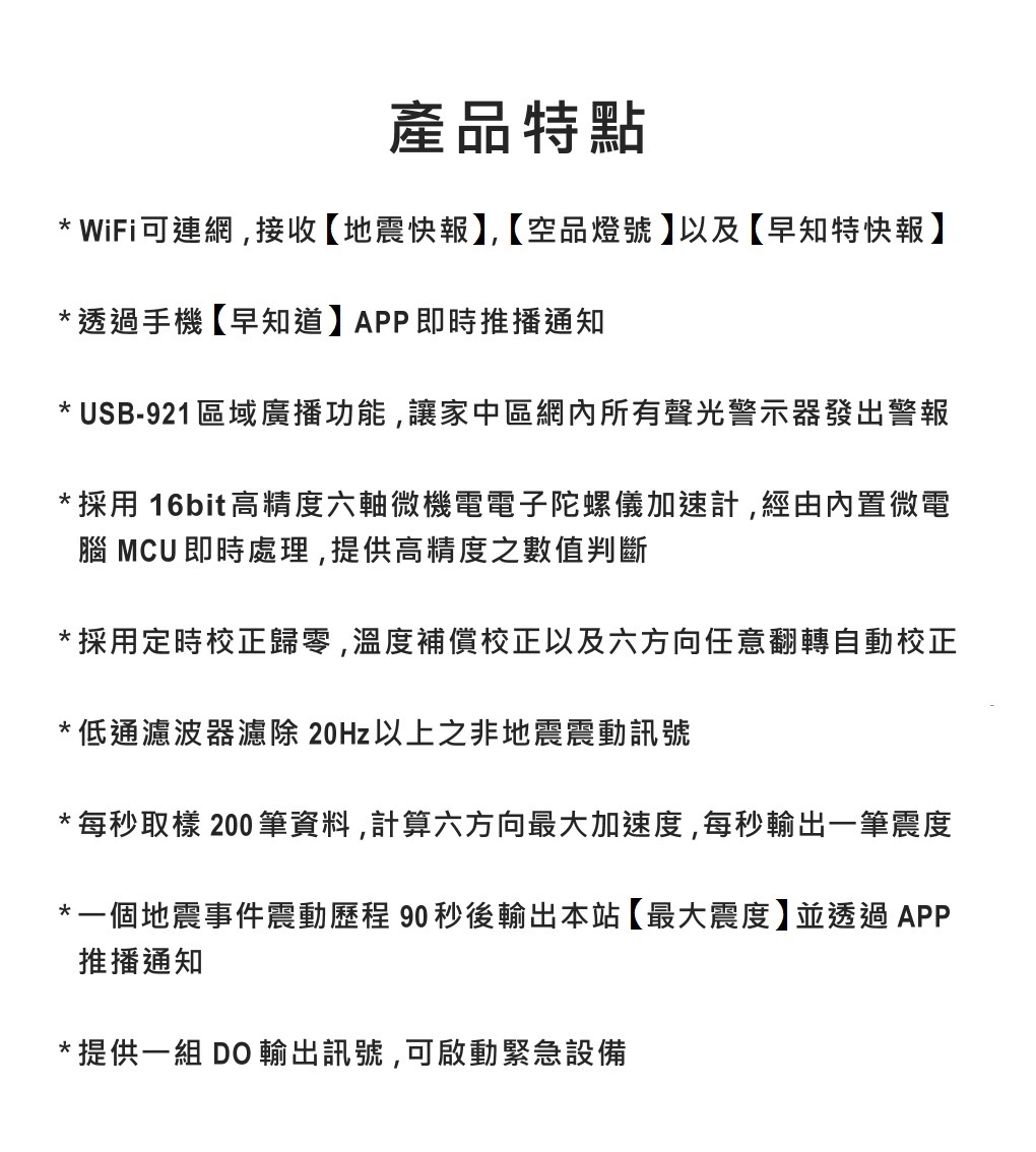 1.USB-921微機電_地震儀 為「預購產品」,所有原物料進口、生產組裝測試以及產品相關的認證等事宜皆會依照並符合台灣相關法規,本公司所研發製造之設備,使用品質、保固、及售後服務與安全性皆會有保障(產地: 台灣原創設計+台灣生產製造)。