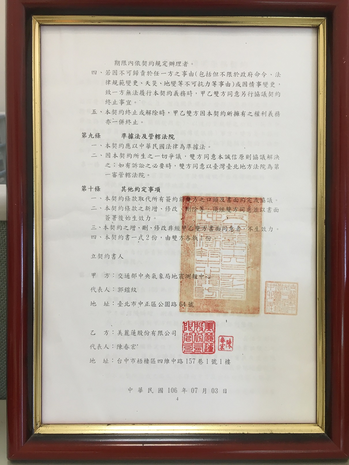 2017 年與中央氣象局地震測報中心簽約 - 轉發(EEW)地震速報給用戶