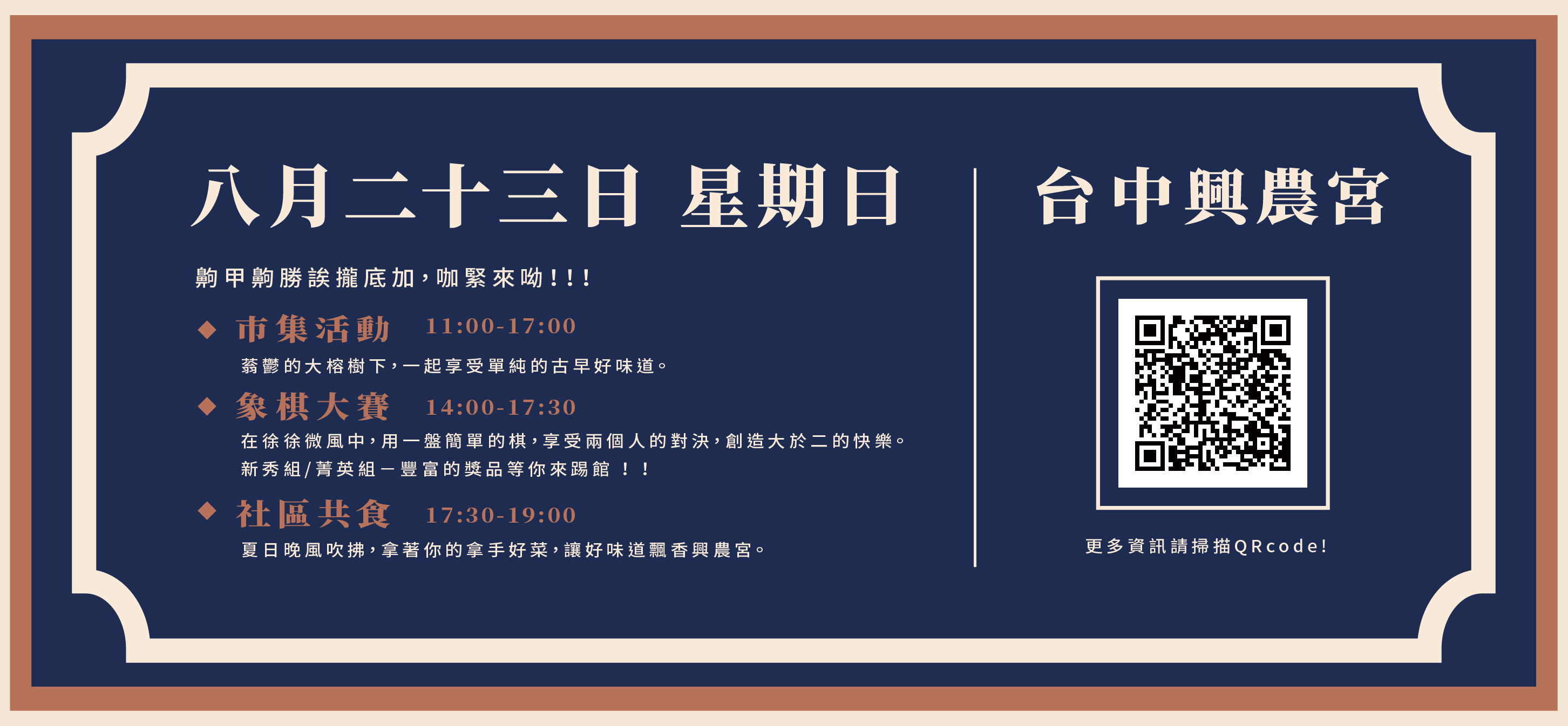 今年我們將在8/23星期日舉辦神農暗弈盃活動,活動包含象棋大賽、傳統古早味市集、還有社區共食,其中象棋大賽報名費為168元新台幣,並附贈一把荷葉扇,此外,凡前30位報名者皆會獲得興農宮平安米一包。第一名者將會獲得1688元、第二名為1288元、第三名為888元以及第四名為666元的發財金,歡迎大家共襄盛舉。