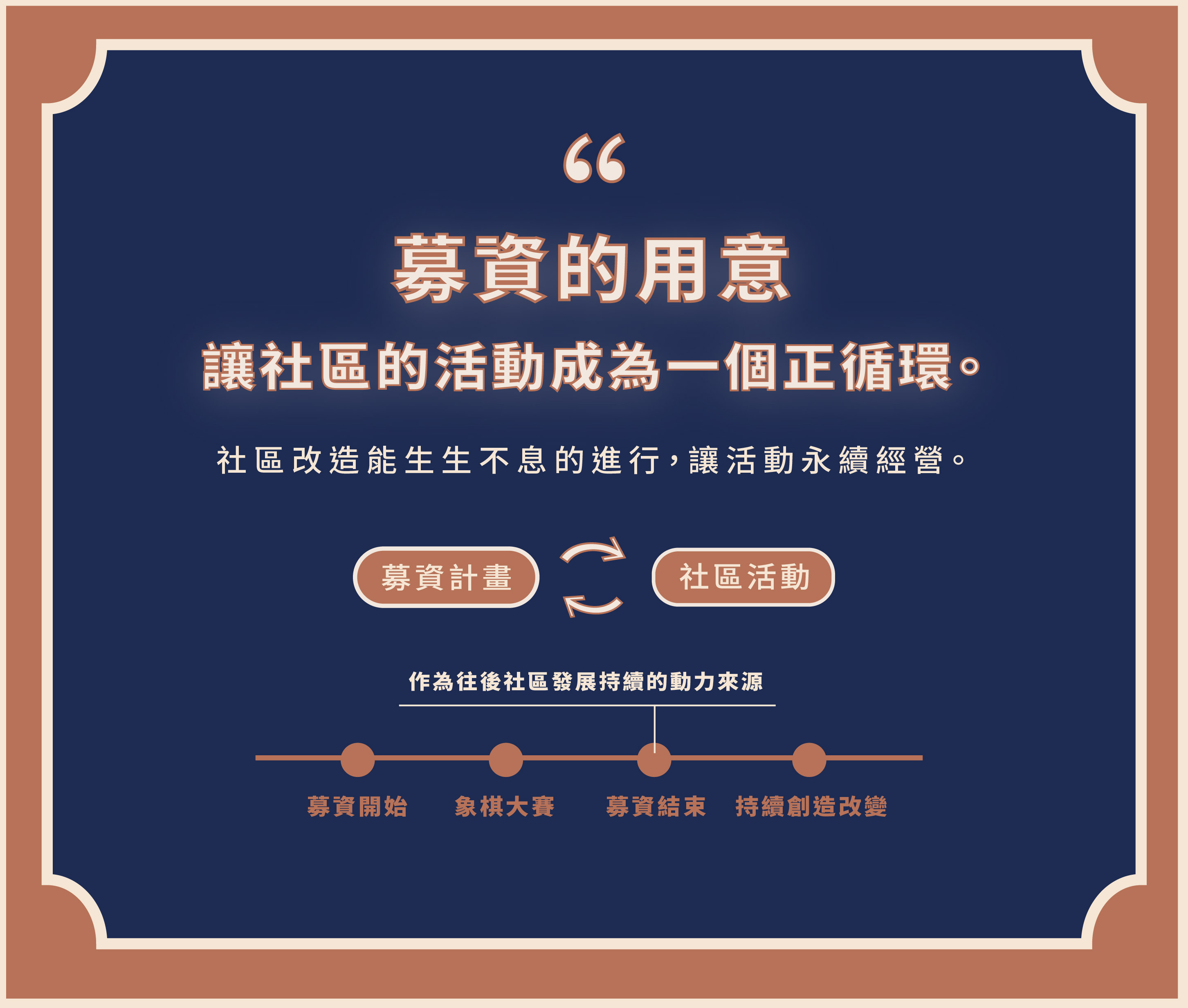 藉由募資讓社區活動可以永續經營,社區改造生生不息地進行,形成正循環,可以成為社區持續發展的動力。希望透過募資讓象棋大賽真的有自己的一個永續模式,比起往年活動贊助,建立可以永續的模式更值得持續深化和推動,進而活絡社區。資金分為短期與長期規劃: