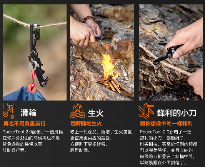 相較於一代產品,PockeTool 2.0擁有多處針對戶外的設計。增加了滑輪功能,可以輕鬆運送過重物品,最大可承重10kg。改進了生火裝置,讓生火比一代更為方便。最大的特點就是新增了一把鋒利的小刀,這把刀不僅可以快速割斷繩子等,在刀的末端還做了鋸齒設計,可以鋸斷樹枝等。