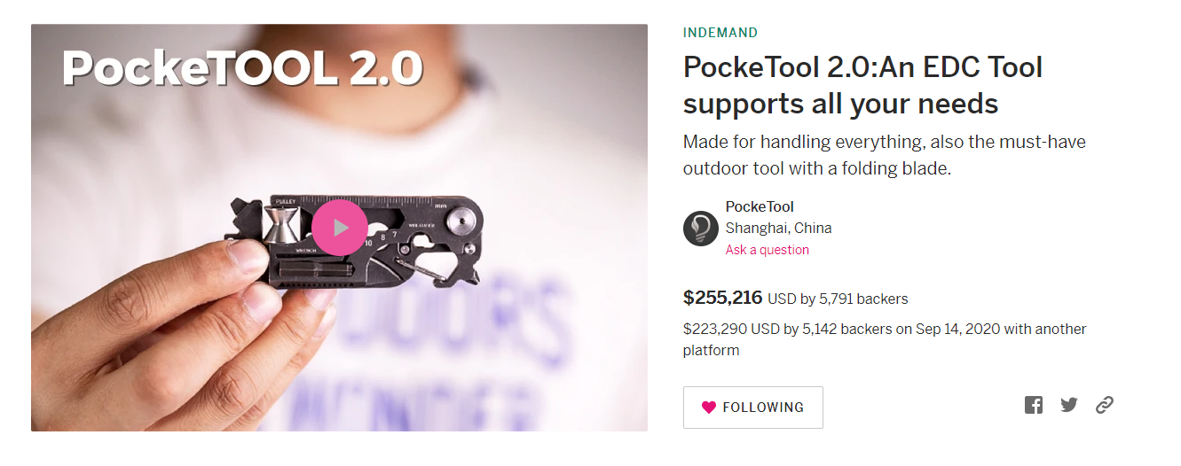 PockeTool2.0在2020年再次登錄Kickstarter募資平台,憑藉上一代產品的優質評價,最終募資金額定格在255,216美金5,791名贊助者。